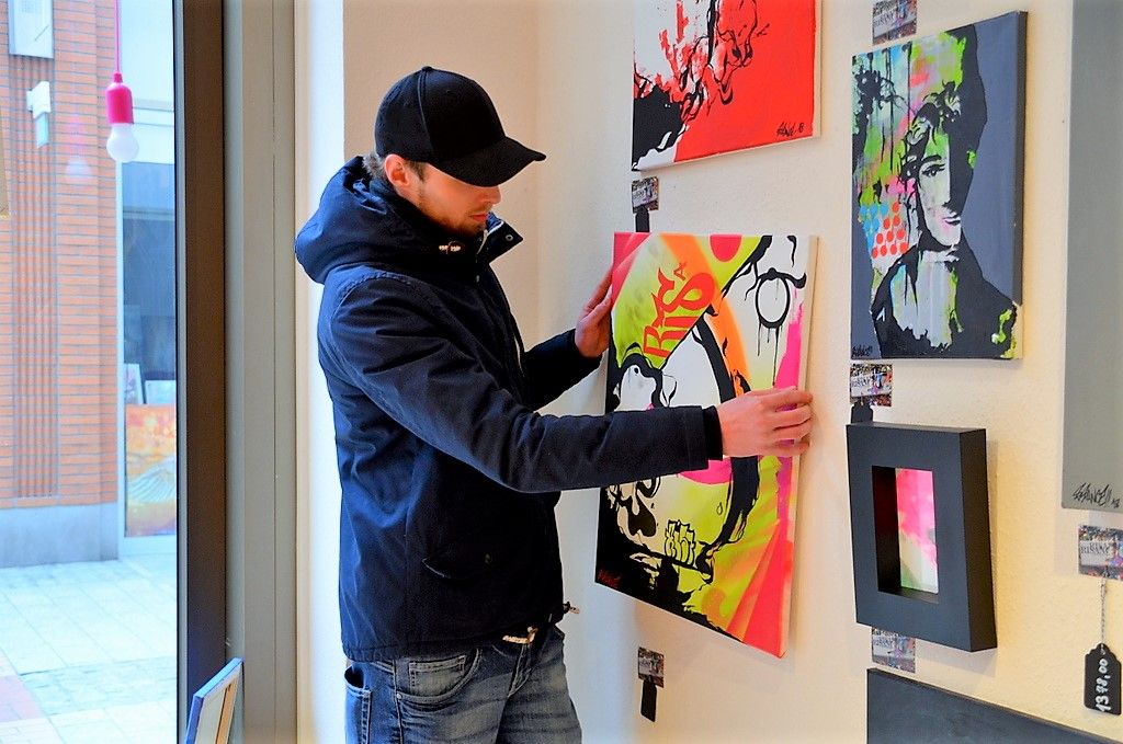 Künstlerkollege Matthias Groß, Risance Objektdesign, ist seit acht Jahren Graffitikünstler und hat auch schon in Solingens Eissporthalle Spuren hinterlassen. Seine Arbeiten sind eine beeindruckende Kombination aus gesprühten Graffitis mit akzentuierter Acrylmalerei. „Die Bilder sind knallig-bunt“, beschreibt Groß seine Arbeiten. „Graffitis haben mich schon immer fasziniert.“