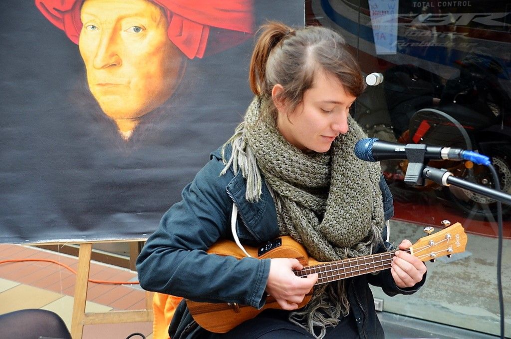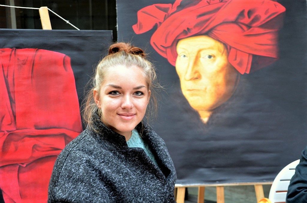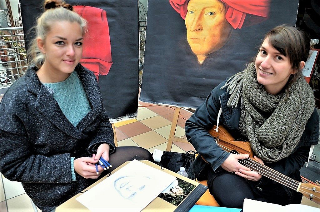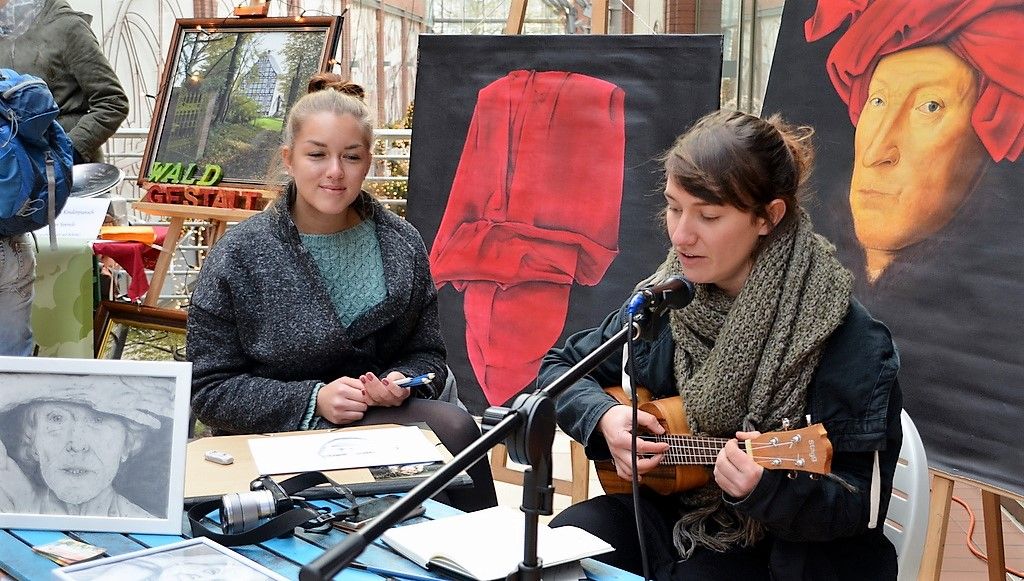 Michelle Siegling und Sarah Frei sind in der Ausbildung zur Theatermalerin. Beide sind glücklich darüber, dass sie ihr Hobby zum Beruf machen können. Sarah hat ihre Ukulele dabei und macht aus dem Stehgreif Musik. Michelle zeigt an zwei Werken die mit Stoffmalfarbe dargestellte Faltenwurftechnik.