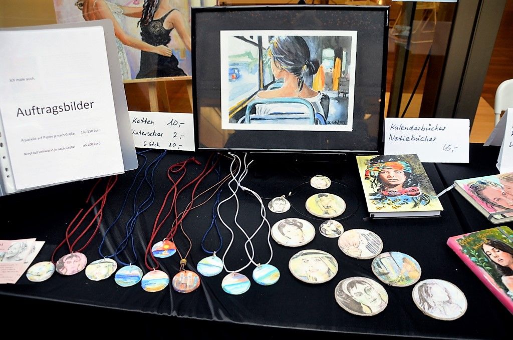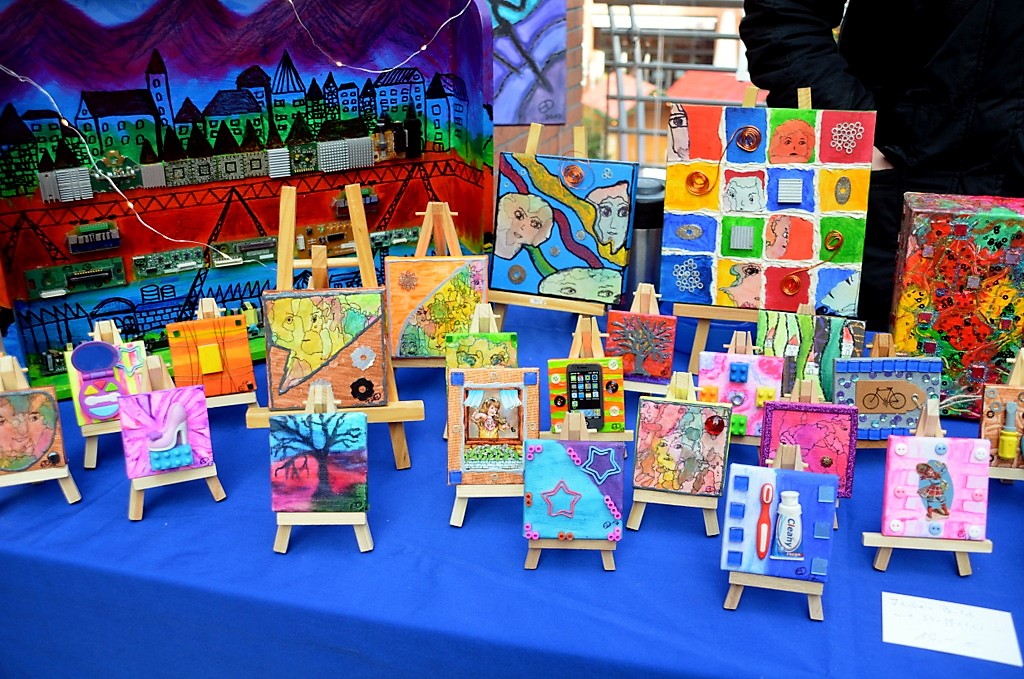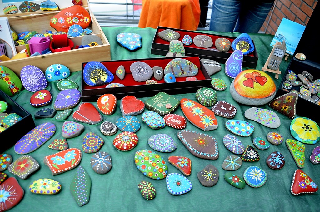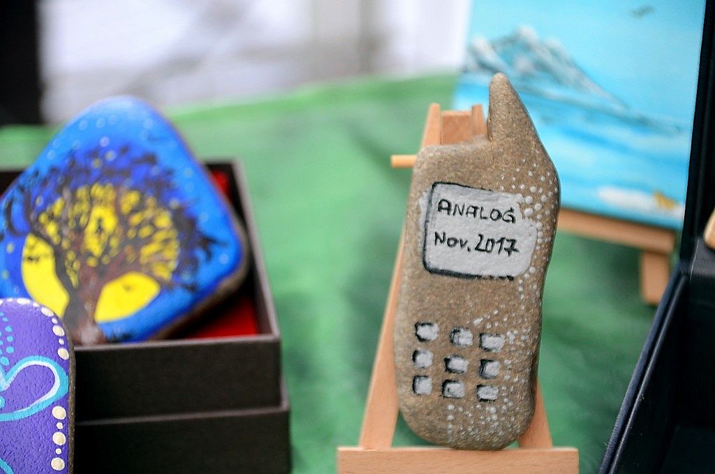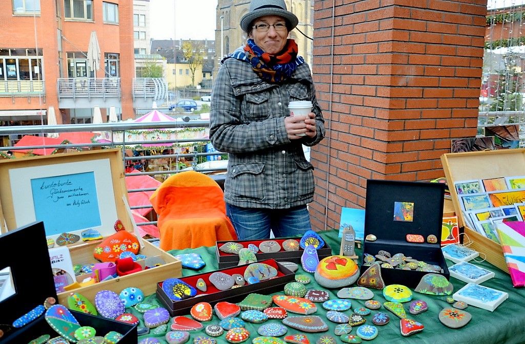 Hundertjährige Schubladen erwachen bei Eva Dittrich zu neuem Leben. Ihr Bild mit reflektierenden CDs entwickelt sich immer wieder neu. Gleich nebenan hat Katy Gluch kunterbunte Glücksmomente zum Mitnehmen ausgebreitet. Flache, glatte Steine sind mit fröhlichen Motiven und bunten Blumen verziert. Auch ein analoges Steintelefon ist dabei. „Ich fahre extra zum Rhein und suche mir die Steine aus“, sagt Katy Gluch und strahlt dabei so fröhlich wie ihre Glücksmomente.