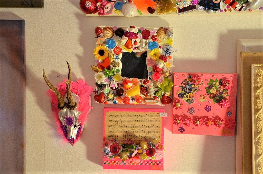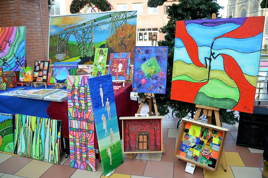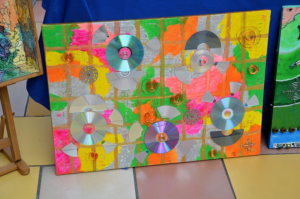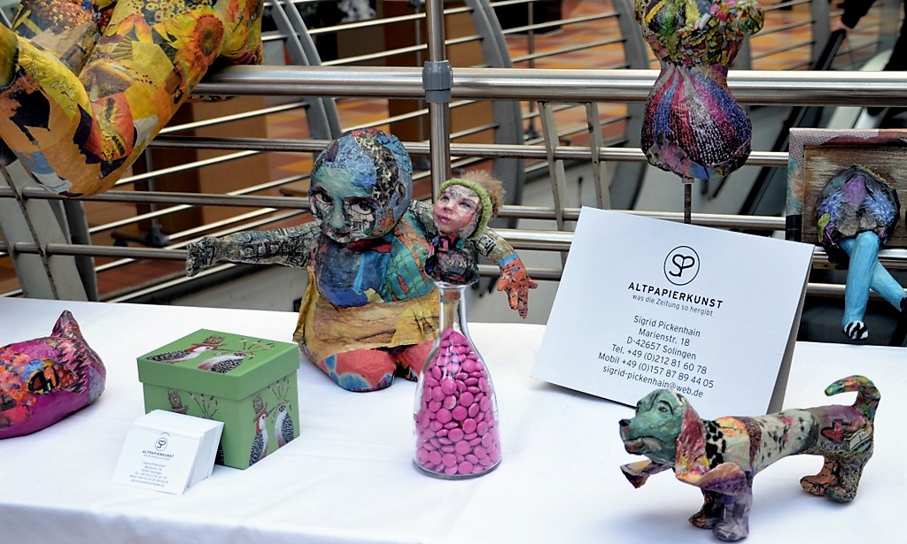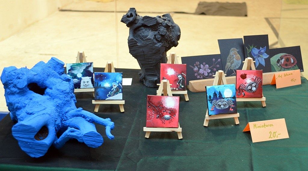 Hundertjährige Schubladen erwachen bei Eva Dittrich zu neuem Leben. Ihr Bild mit reflektierenden CDs entwickelt sich immer wieder neu. Gleich nebenan hat Katy Gluch kunterbunte Glücksmomente zum Mitnehmen ausgebreitet. Flache, glatte Steine sind mit fröhlichen Motiven und bunten Blumen verziert. Auch ein analoges Steintelefon ist dabei. „Ich fahre extra zum Rhein und suche mir die Steine aus“, sagt Katy Gluch und strahlt dabei so fröhlich wie ihre Glücksmomente.