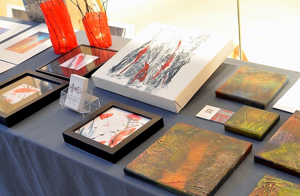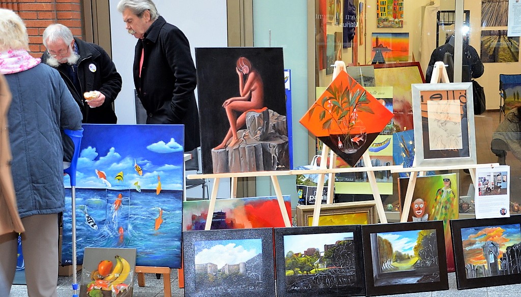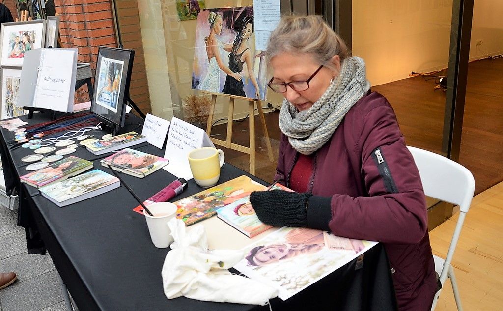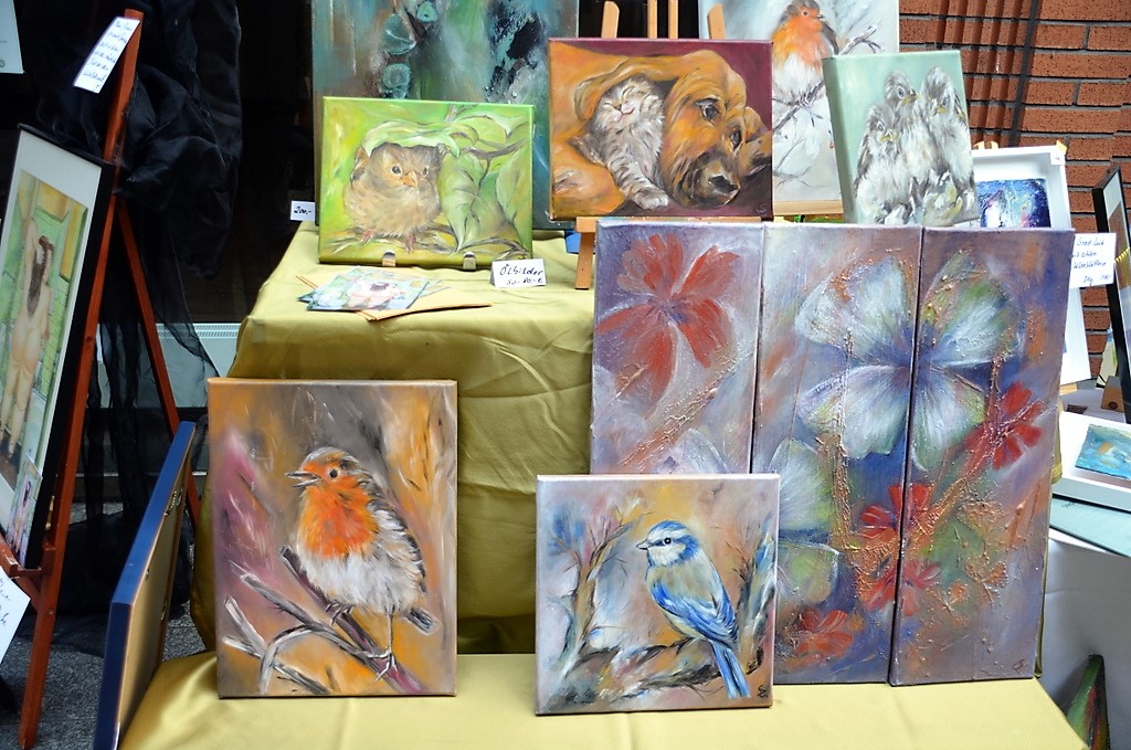 Auf dem Künstlerbasar werden zahlreiche große und kleine künstlerische Werke angeboten. Hier stellt Eva Dittrich Bilder mit Staffelei aus. Unansehnliche Schubladen werden mit Farbe aufgefrischt. (Foto: © Martina Hörle)
