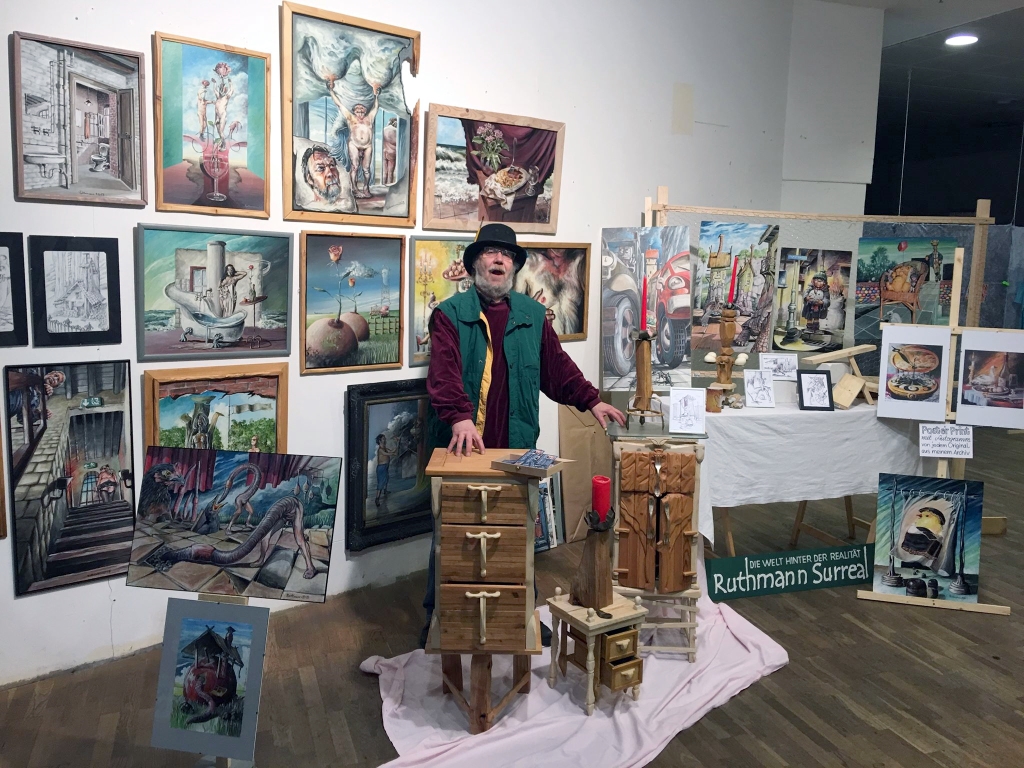 Volker Rauh präsentiert in seiner Galerie expressiv-abstrakte Bilder auf Leinwand/Hartfaser in Öl und Acryl, aber auch per Spraytechnik gefertigte Werke. Bei „Ruthmann Surreal“ stellen gleich mehrere Künstlerinnen und Künstler ihre Werke aus. Lothar Ruthmann bezeichnet seine Kunst als „naiven Surrealismus“. „Meine exzentrische Art soll den Betrachter amüsieren und zum Nachdenken veranlassen“, sagt der Künstler.
