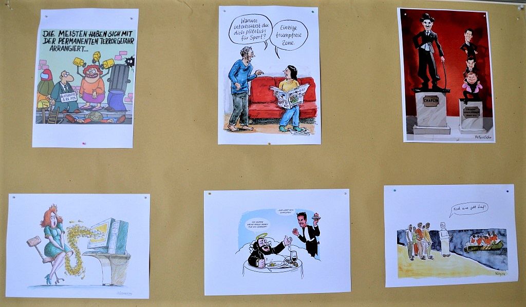 „Die Ausstellung präsentiert ganz unterschiedliche Stile“, so Jan Michaelis, Cartoonist und Organisator der Ausstellung. „Es gibt hyperrealistische Werke, Mehrbildwitze oder den Comicstil.“ Er selbst arbeitet gerne mit Wortspielen. „Der Wortwitz ist ein fester Bestandteil bei Cartoons.“ Viele der rund 30 ausstellenden Künstler stammen aus dem Rheinland. Doch man findet auch Zeichnungen aus Russland, Rumänien und der Schweiz. „Vor allem in letzter Zeit haben die Zusendungen von Frauen zugenommen. Wir bekommen Werke aus dem Iran, aus China und der Türkei.“