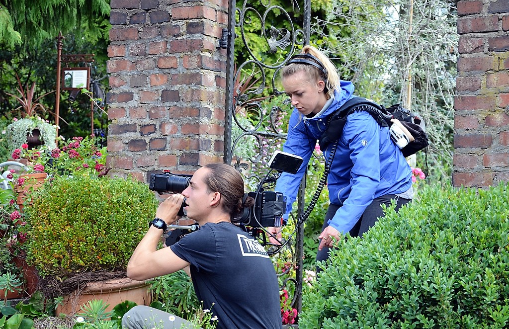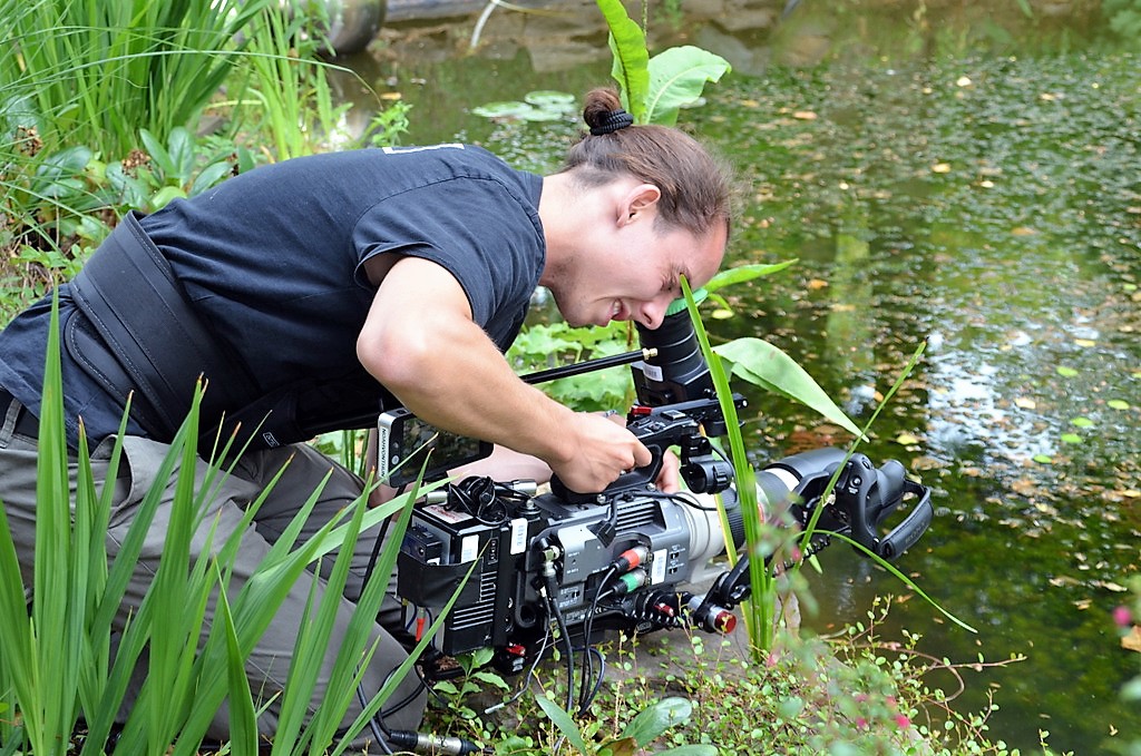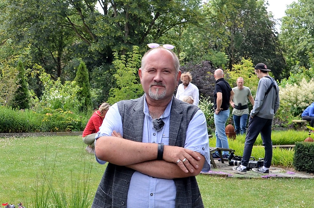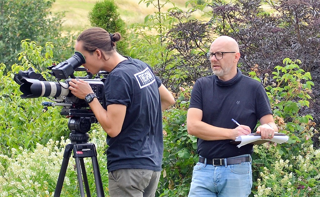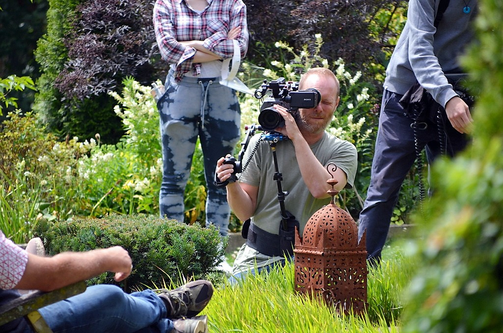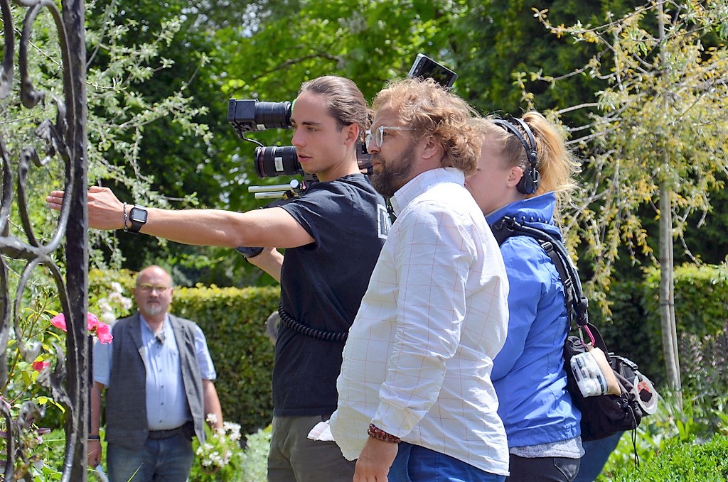 Aufnahmeleiter Christian Voigt sagt dazu: „Ich bin auch zum ersten Mal hier und total überwältigt. Man weiß gar nicht, wo man zuerst hingucken soll. Gebäude, Pflanzen, Skulpturen – überall gibt es etwas zu entdecken. Wir sind überaus herzlich aufgenommen worden. Es ist eine tolle Atmosphäre.“ Natürlich ist es in der relativ kurzen Zeit nicht machbar, die Vielfalt des Gartens komplett zu erfassen. Da muss eine Auswahl getroffen werden. Und so geht Moderatorin Diana Fritzsche-Grimmig mit Thorsten Ulbrich durch den Kiesgarten und plaudert mit Marcus Vogel gemütlich im Liegestuhl am Teich.
