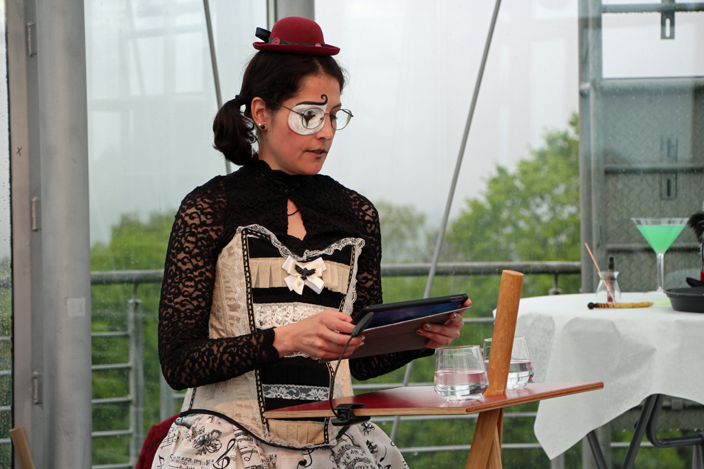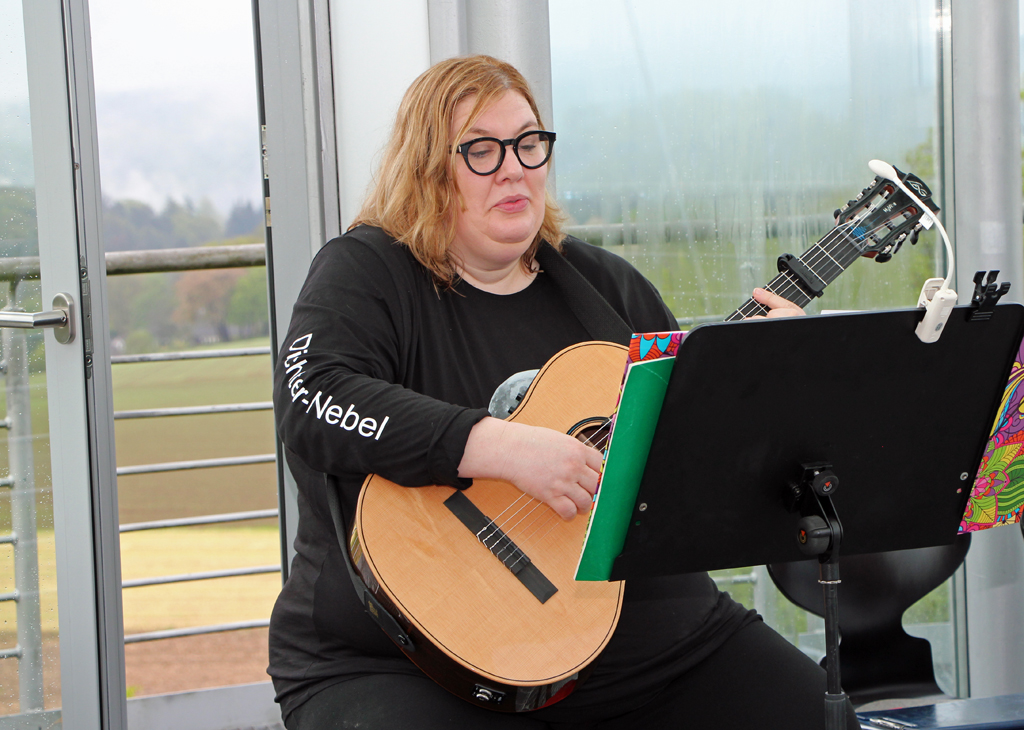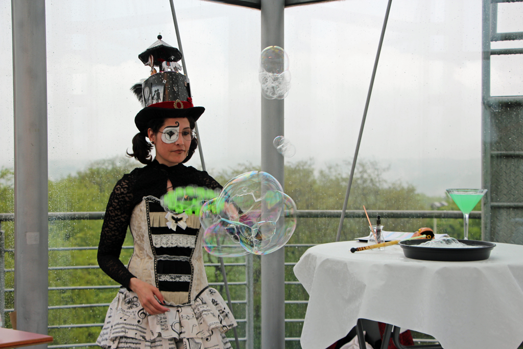 Seifenblasen erinnern an glückliche Kindertage. Remy Matelot ließ mit ihren großen und kleinen Seifenblasen nicht nur Kindheitserinnerungen wach werden, sondern erschuf magische Momente mit ihren von Rauch gefüllten Seifenblasen, die sich beim Zerplatzen in Nebelschwaden verwandelten. Mal verlieh sie mit ihrem Seifenblasen-Zauber den vorgetragenen Texten eine besondere Atmosphäre, mal wurde ihre Performance gemeinsam mit der vollen Stimme von Kerstin Ehmke-Putsch, die zur Gitarre Lieder wie „Fly me to the moon“, „Over the Rainbow“ oder „Das Leben ist schön“ von Sarah Connor vortrug, zu märchenhaften Traumbildern.