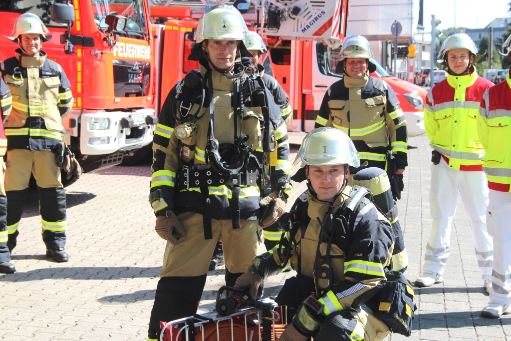 „Man hat beispielsweise das Gefühl, dass man gar nichts mehr auf dem Rücken hat wegen der modernen Polsterung“, berichtete Stefan Hohmann-Gunkel, Sachgebietsleiter Fahrzeuge und Geräte bei der Feuerwehr, über seine Erfahrungen, als er in der neuen Kleidung den schweren Atemschutz mit Sauerstoffflasche anlegte.
