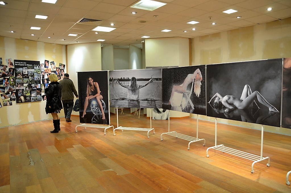 Adolphs nennt seine Ausstellung „Der Knypser und das Wasser“. Die Bezeichnung Knypser sei vor einiger Zeit mehr durch ein Versehen entstanden, schmunzelt er. Doch das habe er als Alleinstellungsmerkmal beibehalten. In seinen hier präsentierten Arbeiten fokussiert er sich auf das Thema Wasser. Großformatige Werke zeigen Menschen am und im Wasser. Dass es sich dabei vorwiegend um Frauen handelt, war nicht geplant. Es hatte sich einfach so ergeben.