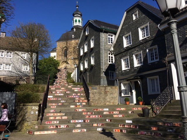 „Gerade beim Gräfrather Kulturmorgen hat sich Dirk Balke als großartiger Organisator und Künstler hervorgetan“, lobte der Vorsitzende. „Er hat mit den 225 Augenpaaren die große Treppe auf einzigartige Weise gestaltet.“ Sein persönliches Highlight, verriet Hankammer. „Ein großartiges Gefühl, wenn mich diese vielen Augenpaare ansehen, während ich die 72 Stufen hoch gehe.“ Deutlich war die nachhaltige tiefe Begeisterung über diese Installation zu spüren.