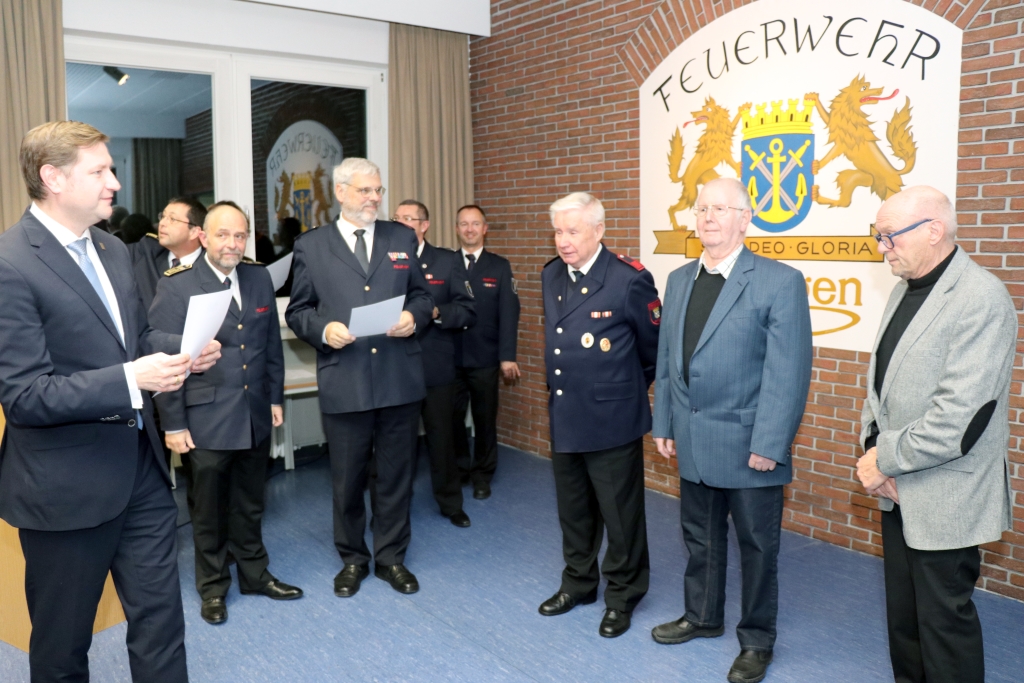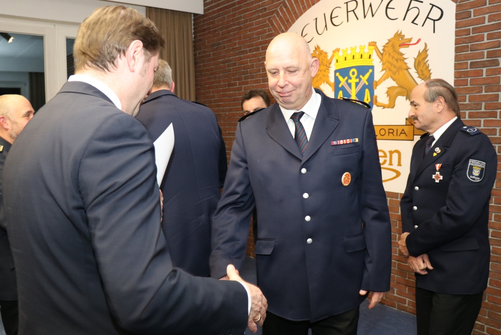 Geehrt wurden am Donnerstag zahlreiche Anwesende, aktive und ehemalige Angehörige der freiwilligen Löscheinheiten, der Werkfeuerwehren und der Berufsfeuerwehr für ihren teilweise jahrzehntelangen Einsatz in den jeweiligen Einheiten der Feuerwehr Solingen. Urkunden, Abzeichen und Honneurs gab es für 25, 35, 40, 50 und 60 Jahre Mitgliedschaft bzw. Dienstzeit bei der Solinger Feuerwehr. Oberbürgermeister Tim Kurzbach lobte in seiner Ansprache den festen Zusammenhalt in der Solinger Feuerwehr.