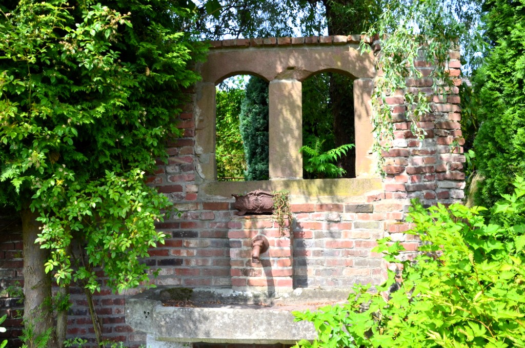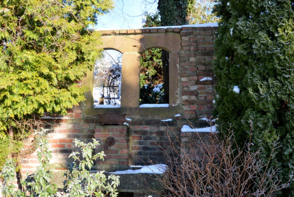 Ein gemauertes, etwa drei Meter hohes Tor im Jugendstil führt in den Klostergarten hinein. Der Torbogen stammt aus Nürnberg. Marcus Vogel erinnert sich noch gut: „Es war ein Tag im Januar vor 12 Jahren. Wir sind hingefahren und haben das Teil abgeholt.“ In der Mitte des Torbogens ist ein Kreuz zu sehen. Die beiden Pfeiler wurden in Eigenregie selbst gemauert. Gleich am Eingang rankt eine winterblühende Clematis, während ein kleiner Brunnen munter vor sich hinplätschert. Das Becken des Brunnens stammt aus dem Münsterland und war ursprünglich eine alte Viehtränke.