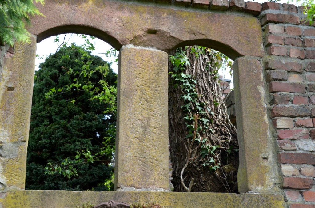 Ein weiteres Highlight des Gartens ist ein Fenster aus der Renaissancezeit, das an der Rückseite des Gartens den Blick auf ein weiteres Gartenzimmer freigibt. Dieses und viele andere Exponate wurden von Marcus und Thorsten bei Antiquitätenhändlern erstanden und verleihen dem Garten eine ganz besondere Note. Links neben dem Fenster führt ein Tor hinaus aus dem Klostergarten. Es wird auf der einen Seite flankiert durch eine zauberhafte Rose, auf der anderen Seite ragt ein beeindruckender Ilex hoch in die Höhe. Steinerne Pokale zieren das Dach der Torpfeiler.