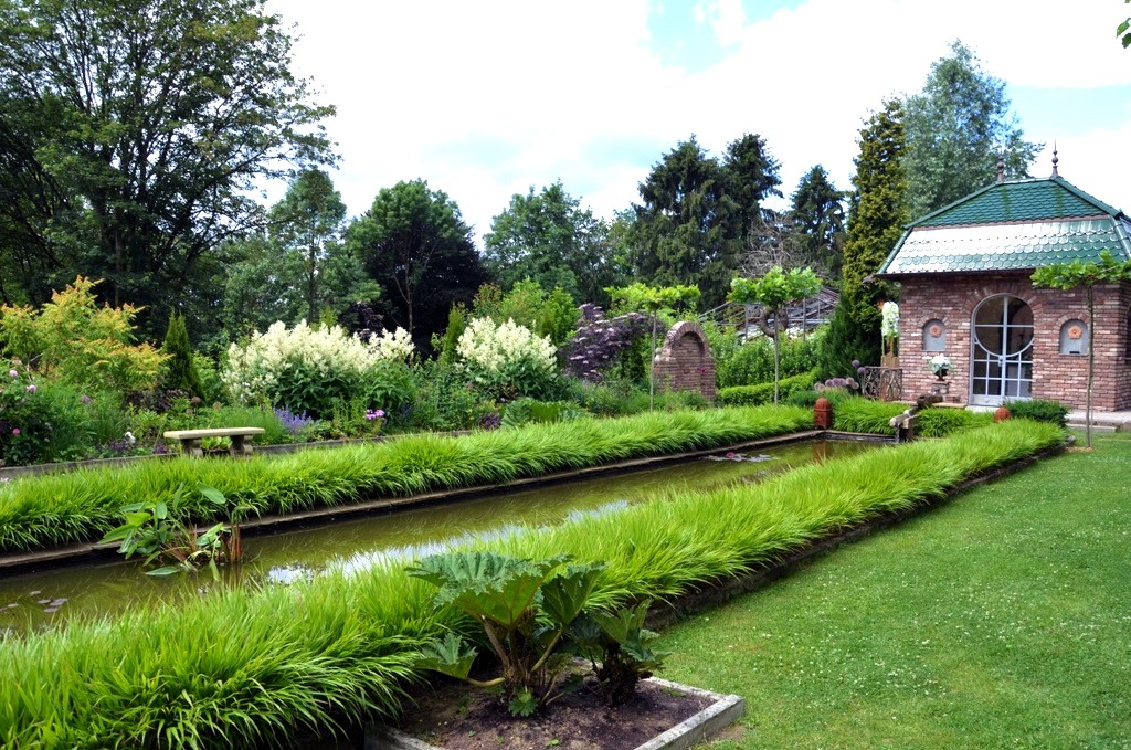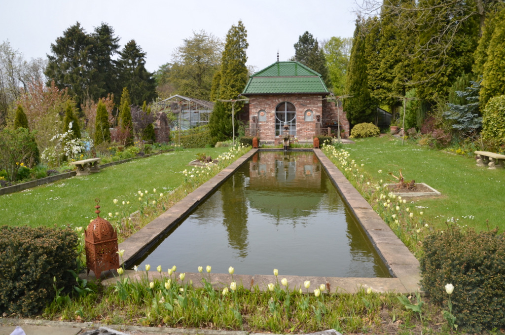 Zwei Liegestühle am Anfang des langen Beckens sind wie geschaffen zum Ausruhen. Von diesem Platz aus hat man einen beeindruckenden Blick über den Teich hinweg bis zur Kapelle. Zu beiden Seiten des Teichs blühen das ganze Jahr über die verschiedensten Blumen, kombiniert mit Stauden und filigranen Gräsern. Steinerne Sitzbänke laden zum Verweilen ein. Ein idealer Platz – nicht nur für die beiden Gärtner, die ihren Abend dort gerne gemütlich ausklingen lassen, sondern ebenso bei den Besuchern beliebt.