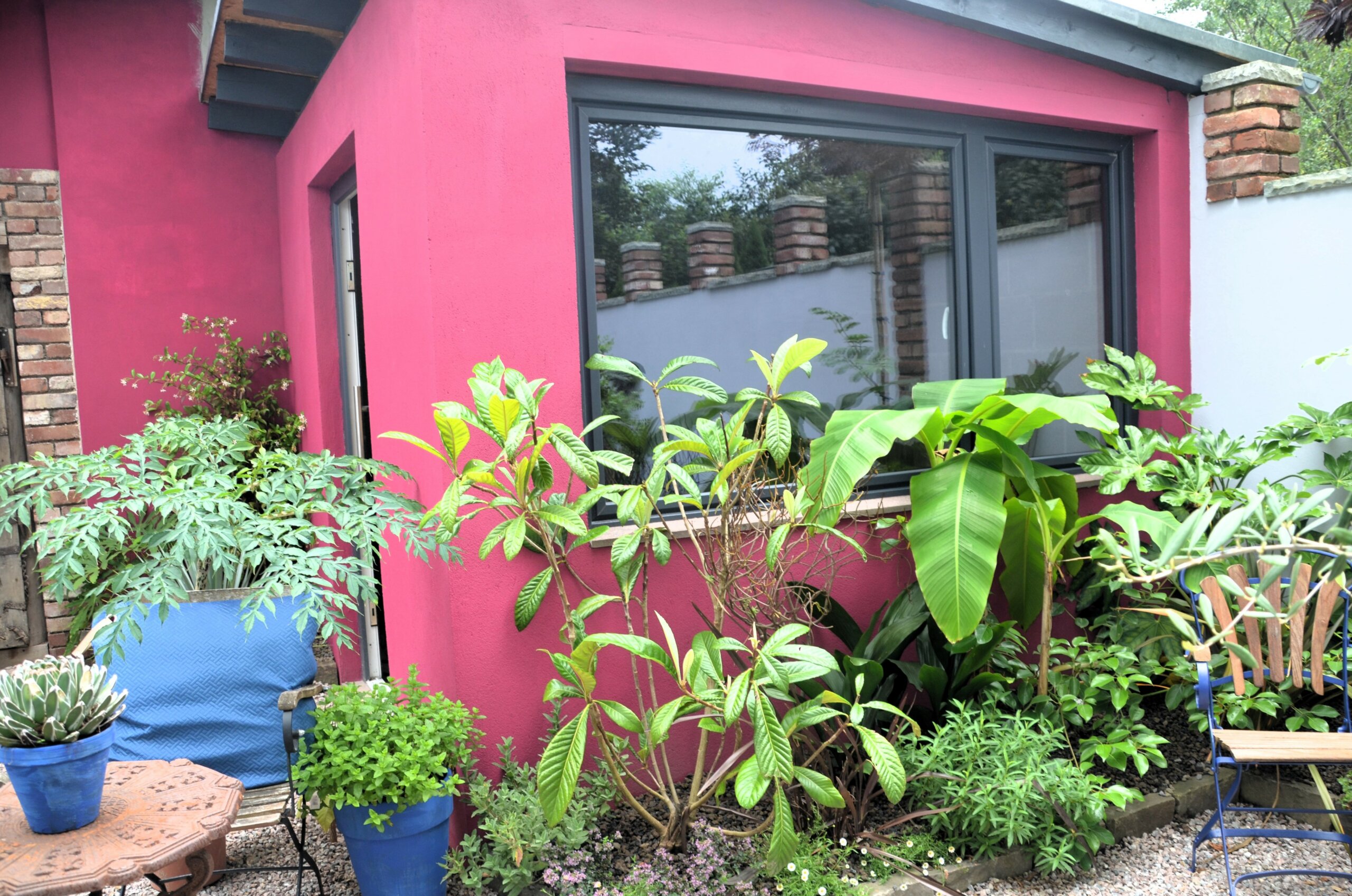 Rechts befindet sich ein kleiner, ebenfalls himbeerfarbener Raum, der momentan noch auf der Suche nach seinem endgültigen Verwendungszweck ist. Davor laden eiserne Stühle mit passenden runden Tischchen zum Verweilen ein; bequeme Kissen im Majorelle-Blau vervollständigen diese gemütliche Sitzecke.