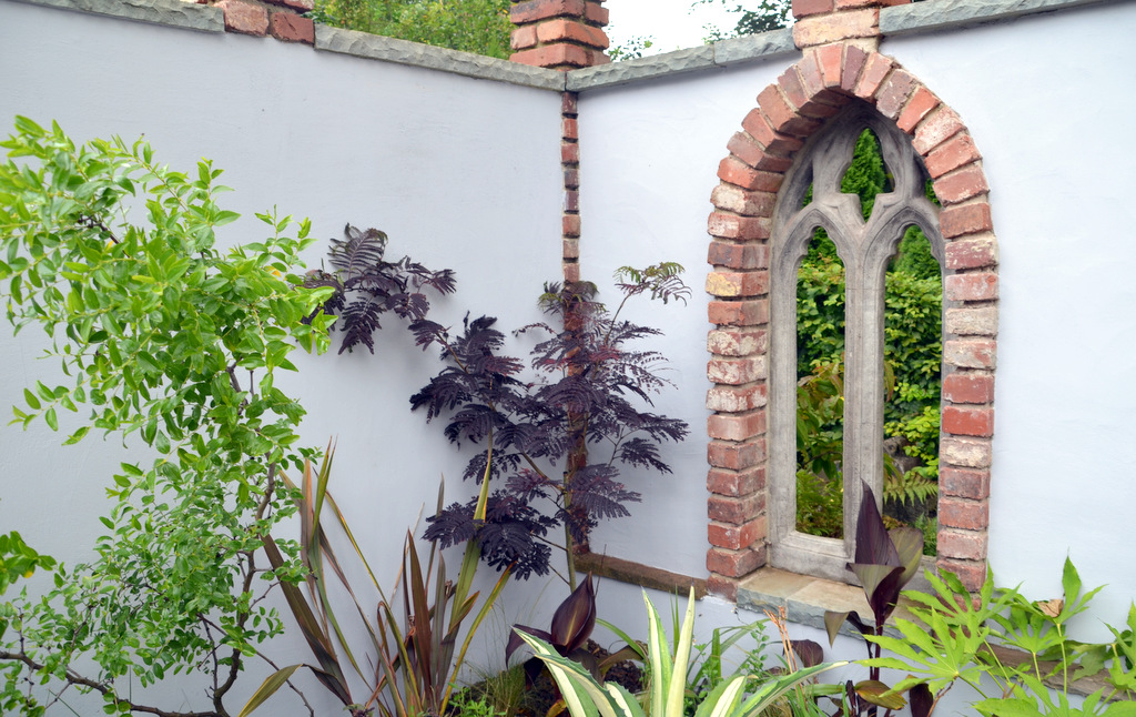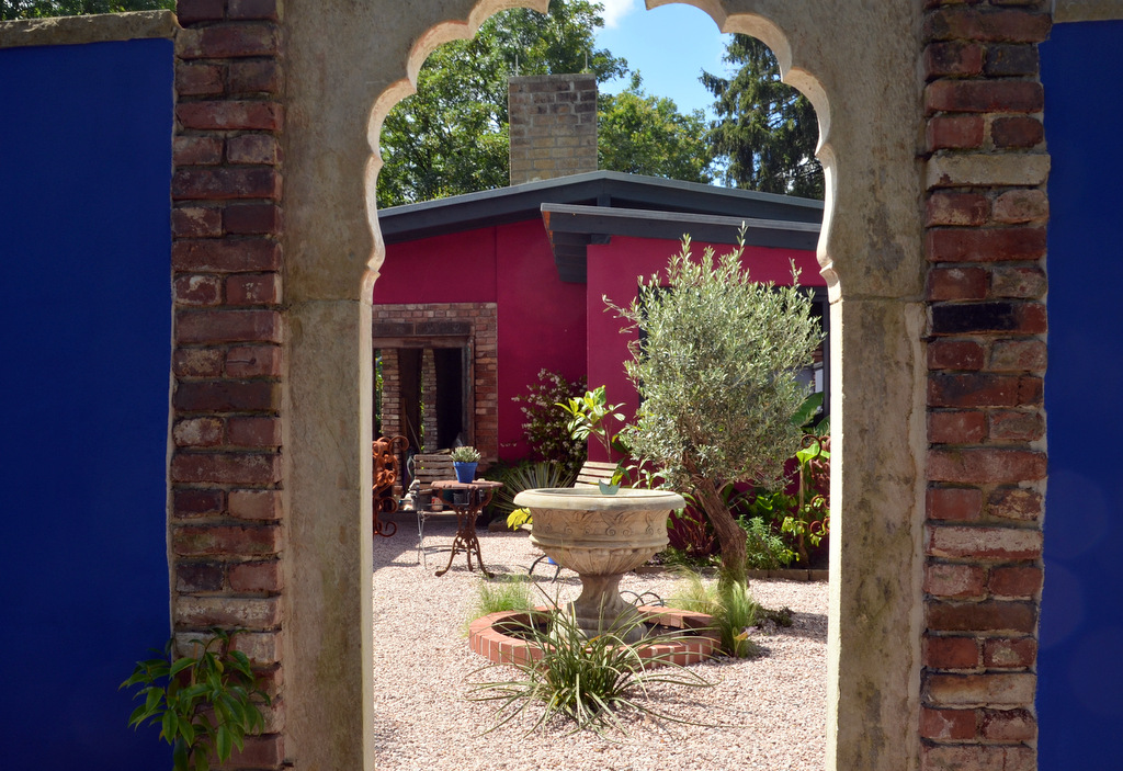 Der Zugang zu diesem einzigartigen Gartenzimmer erfolgt über einen rund zehn Meter langen Weg, der durch den Frühlingsgarten (wir berichteten) führt. Hier wird der Besucher von den Überbleibseln eines Gewächshauses aus den 1920er Jahren empfangen. Die alten Mauern wurden geschickt in die neue Gestaltung integriert und verleihen dem Raum einen nostalgischen Charme. Zinnen krönen die Wände und schaffen eine interessante Silhouette, während ein indischer Bogen, erworben von einem holländischen Antiquitätenhändler, das Eingangsportal ziert und den Betrachter in eine Welt voller Geheimnisse und Geschichten entführt.