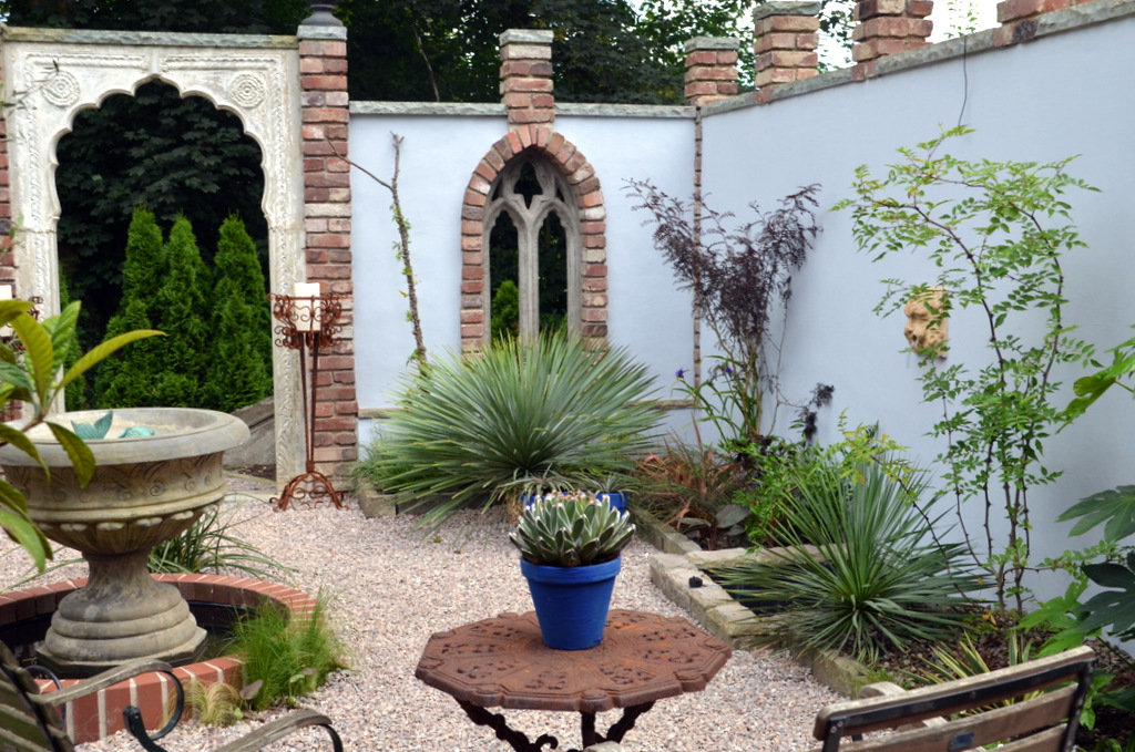 Die Innenwände sind in einem dezenten Grauton gehalten, was die Farbenpracht der Pflanzen noch mehr zur Geltung bringt. Alte Steine wurden gesammelt und zu niedrigen Umrandungen verarbeitet, die mit Erde gefüllt sind und erlesene mediterrane Gewächse beherbergen. Unter diesen Pflanzen findet sich ein Duft-Jasmin, der windgeschützt in einer Mauerecke steht, sowie roter und weißer Szechuanpfeffer neben einer Yucca rostrata. Die blaublättrige Palmlilie, wie man die Pflanze auch nennt, stellt mit ihrem auffälligen Blattwerk einen echten Hingucker dar.