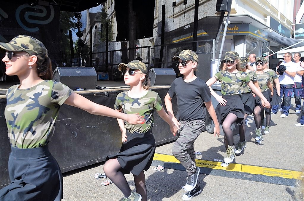 Auf der Bühne Wittenbergstraße lief zu schwebenden Seifenblasen die Formation der Himmelsfunken ein. Im Tarnanzug olivgrün eroberten die Tänzerinnen und Tänzer die Bühne mit ihrer Darbietung. Das Bluesrocktrio 30 Blue Fingers sorgte auf der Bühne Forststraße für Begeisterung. Holger Brinkmann, Ralf Schusdziarra und Jan Christoph Heinsch spielten mal rockig, mal poppig, mal Soul.