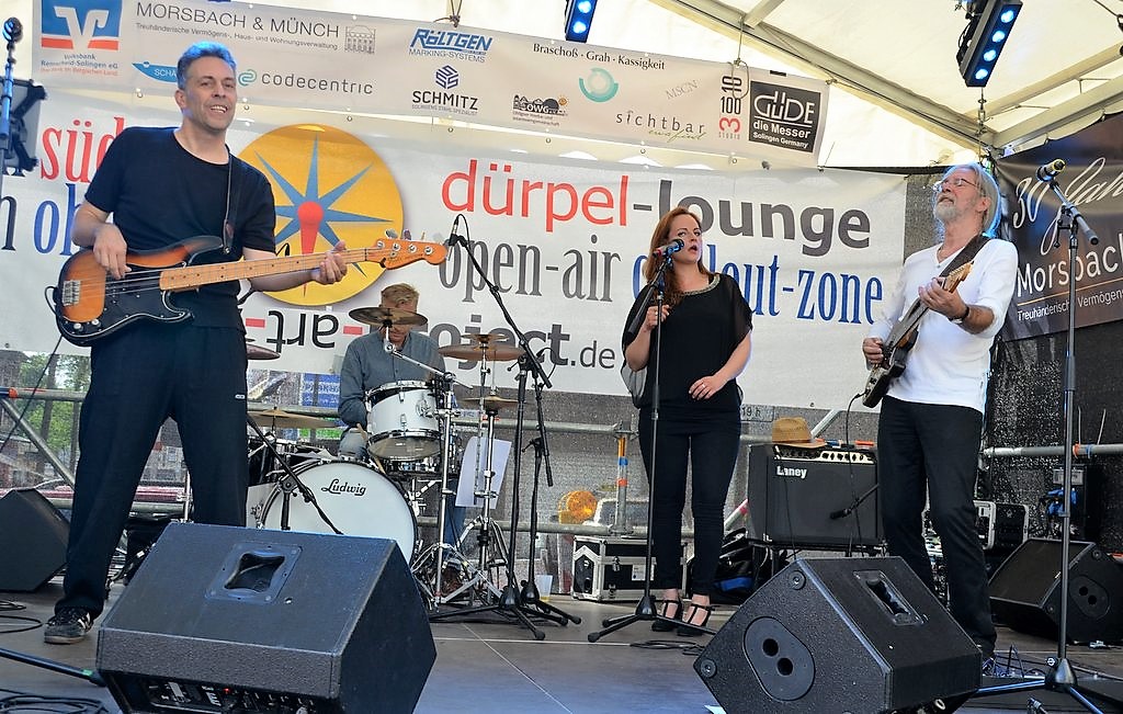 Die Band Monkey Maze begeisterte mit Rock, Funk und Blues auf der DürpelFest-LoungeBühne „Im Süden von Ohligs“. V. li. Michael Trappe, Tatjana Klanfar, Thomas Jungbluth, Ingo Schleutermann (Foto: © Martina Hörle)