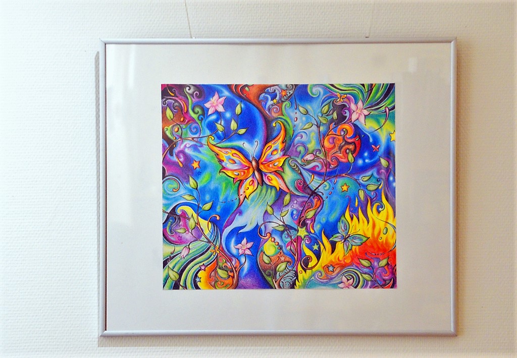„Es ist mein erstes Werk in Acryl“ erzählt Steinmüller über den lilafarbenen Vogel, den sie als Motiv in einem Buch gefunden hatte. Außer diesem Werk hängen mehrere Dreier-Serien von ihr zwischen den größeren Arbeiten. Vanessa Rohrbeck zeigt Varianten ihrer Schäferhündin Maze. Mal tobt das Tier mit der besten Freundin, mal schaut es als Welpe auf die nebenhängende Fotografie, die sie als ausgewachsenes Tier zeigt. Auch der Nachbarhund „Blue“ wurde fotografisch festgehalten. Beeindruckend, wie die Augen des Tieres aus dem Bild heraus leuchten.