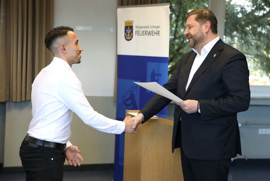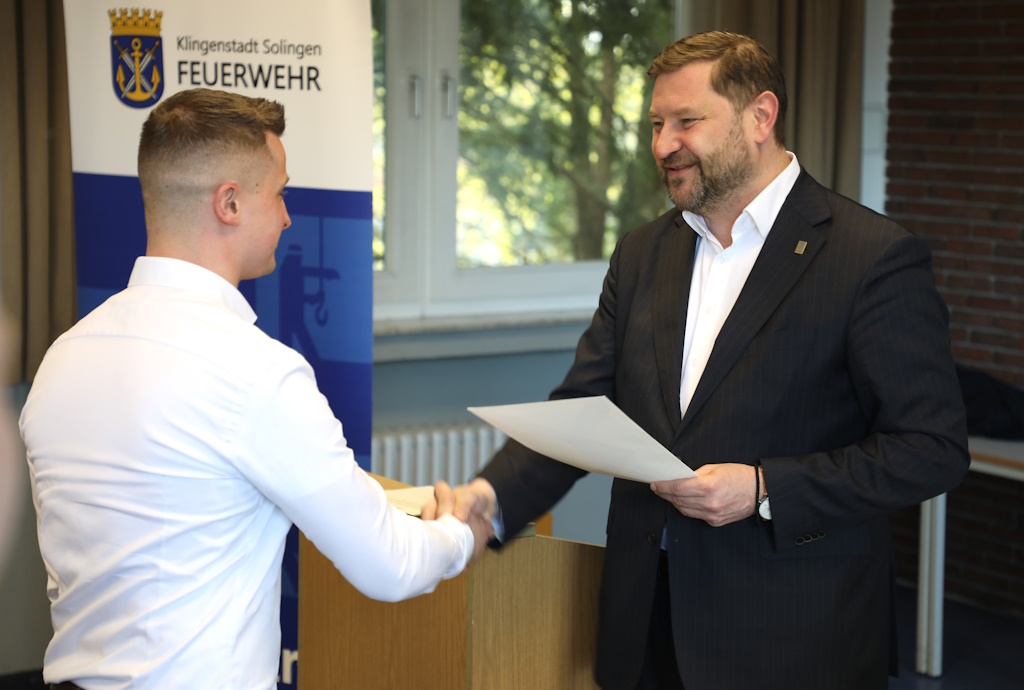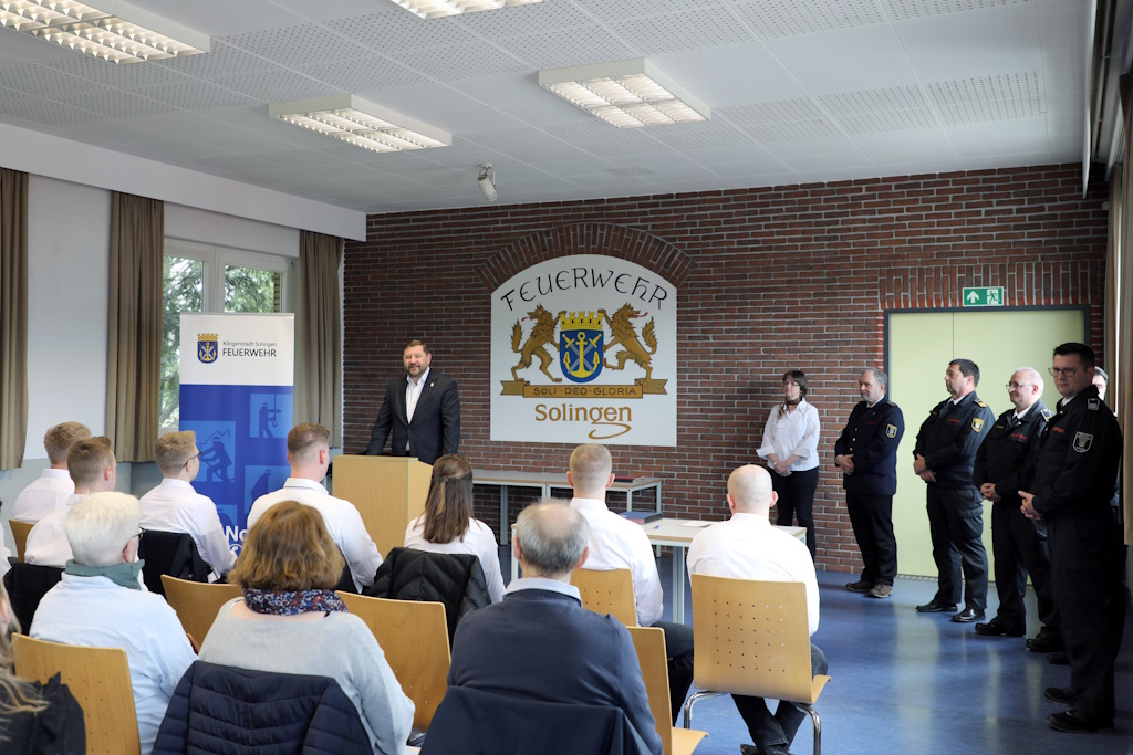 Außer dem Oberbürgermeister waren der zuständige Feuerwehrdezernent Beigeordneter Jan Welzel, der Solinger Feuerwehrchef Dr. Ottmar Müller und der Leiter der Feuerwehrschule Calogero Vinciguerra sowie Familienangehörige der angehenden Feuerwehrleute in der Aula der Walder Feuerwache anwesend.
