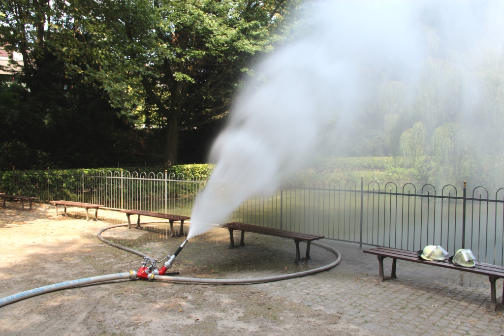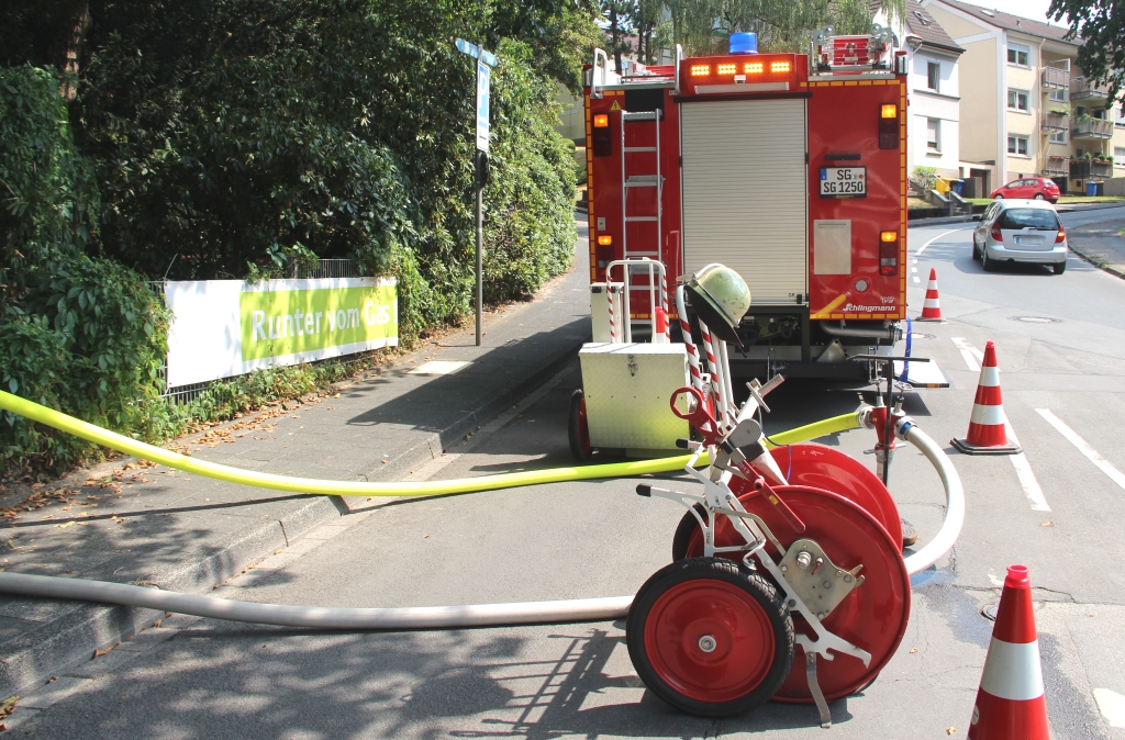 Während der kleinere Teich am Spielplatz von einem Tanklöschfahrzeug der Berufsfeuerwehr mit 8.000 Litern Wasser aufgefrischt wurde, hatten Angehörige der Löscheinheit 6 (Gräfrath) der Freiwilligen Feuerwehr das Gewässer im Eingangsbereich an der Gerberstraße nach nur einer halben Stunde bereits mit rund 25.000 Litern Wasser versorgt, das direkt via Hydrant aus dem öffentlichen Netz kam. An den Pegeln änderte die Frischwasserzufuhr allerdings nicht sehr viel. Das wurde aber auch nicht erwartet.