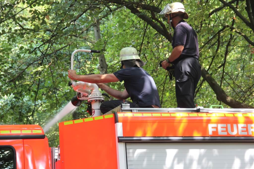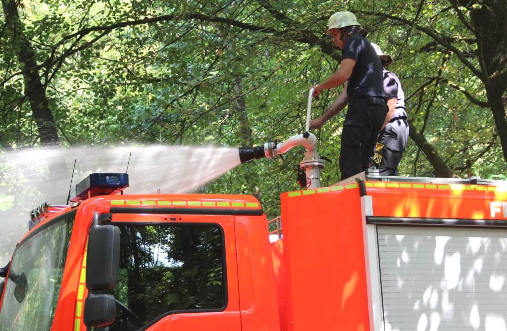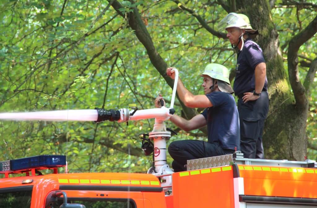 Das Tanklöschfahrzeug musste einmal neu aufgefüllt werden, da die Kapazität des „Tankers“ auf 4.000 Liter Wasser begrenzt ist. Mit einem auf dem Fahrzeug installierten Wasserwerfer haben die Beamten das kühle Nass im hohen Bogen auf die Oberfläche des Teichs geschossen.