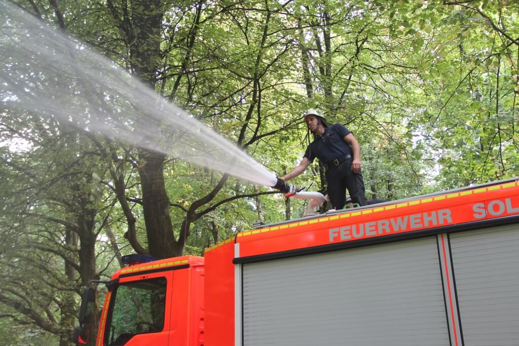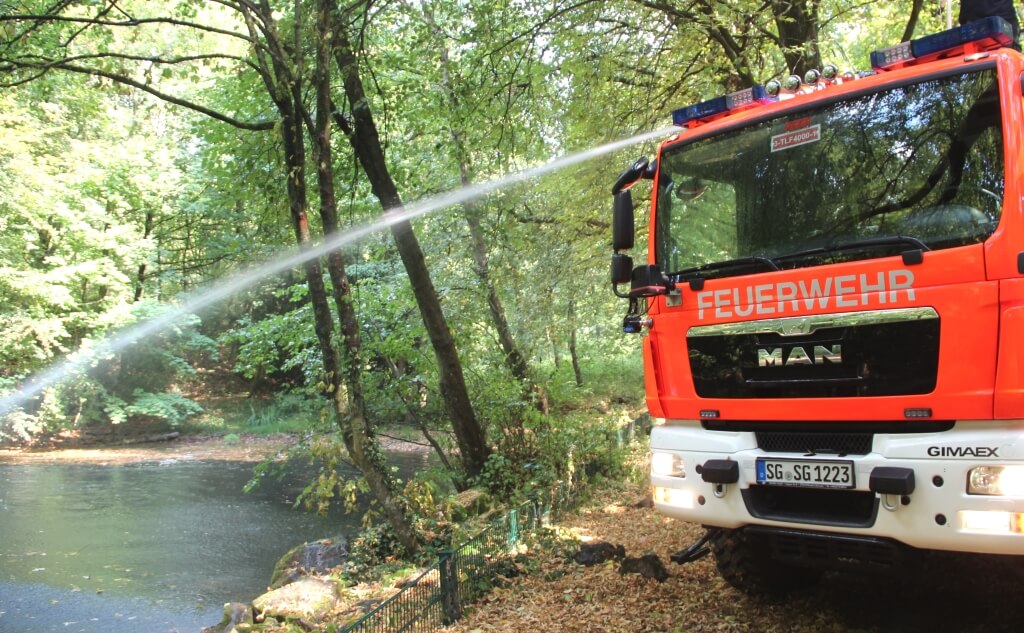 Die Feuerwehr rückte deshalb am Freitag mit einem Löschfahrzeug und einem Tanklöschfahrzeug nach Gräfrath aus, um den Technischen Betrieben unter die Arme zu greifen. „Wir geben Wasser an die Oberfläche, um wieder Sauerstoff in die brachen Teiche reinzubringen und die Fische am Leben halten zu können“, so Dunkel weiter.