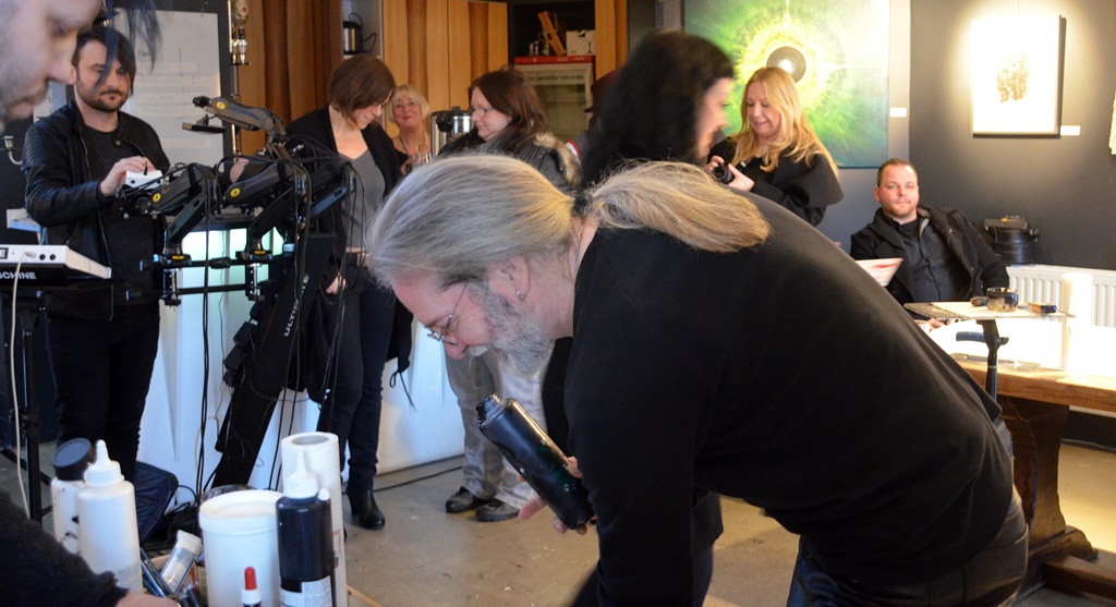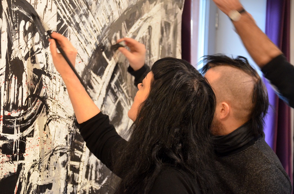 Nach einer kleinen Pause, in der die Gäste das Kollektivgemälde ausgiebig betrachten konnten und sich ausnahmslos begeistert äußerten, gab es noch ein Bonbon. Unter den Händen der Künstler entstanden in kurzer Zeit einzigartige kleine Kunstwerke, die nach einer kurzen Trocknung noch am gleichen Abend mitgenommen werden konnten.