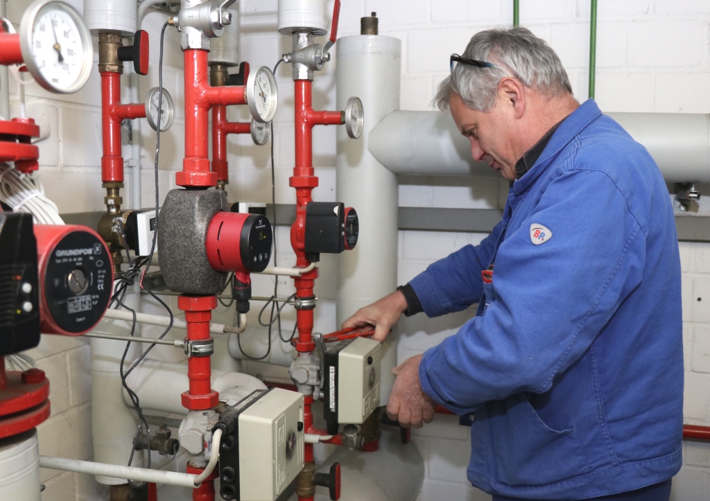 Zum Kerngeschäft des Solinger Unternehmens gehört der Heizungsbau. Hier überprüft Zentralheizungs- und Lüftungsbauer Martin Schäfer eine Anlage. (Foto: © Bastian Glumm)
