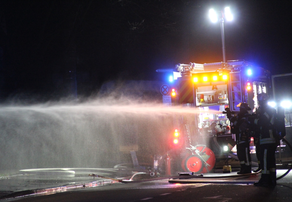 Die Berufsfeuerwehr war mit Kräften der Feuer- und Rettungswachen I (Mitte) und III (Wald) im Einsatz. Die Stadtwerke mussten für Teile der Focher Straße den Strom abschalten. (Foto: © Bastian Glumm)