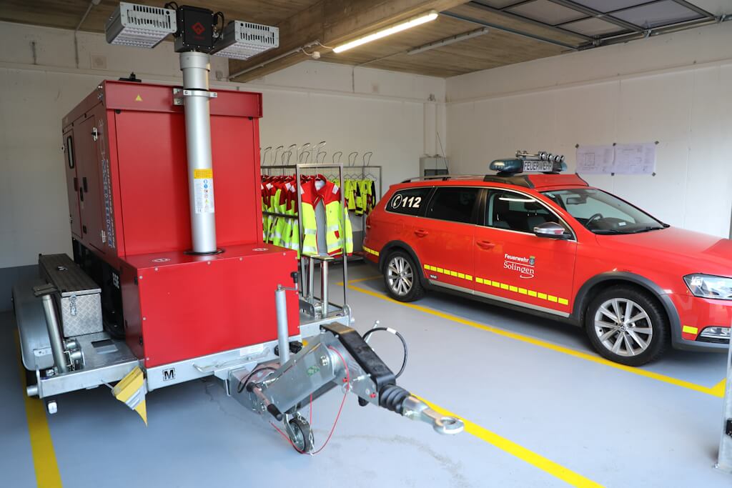Mit dem Erweiterungsbau wurde zugleich ein weiteres Defizit am Standort behoben. Bisher gab es in Burg keine eigene Notstromversorgung für das Gerätehaus. Wagner: „Die Notdtromversorgung ist jetzt sichergestellt durch ein mobiles Gerät als Anhänger.“ Das Aggregat könne bei Bedarf aus der Halle gezogen und zur Einspeisung genutzt werden, sodass der Standort auch bei großflächigen Stromausfällen arbeitsfähig bleibe. Das gerät belegt den zweiten Stellplatz im Erweiterungsbau.