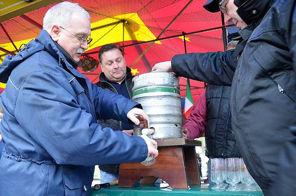 SOLINGEN (mh) – Mit traditionellem Fassanstich eröffnete Bezirksbürgermeister Richard Schmidt (SPD) am Freitag um 16 Uhr die Frühjahrskirmes auf dem Parkplatz Weyersberg. Wilfried Hoffmann, Vorsitzender des Schaustellerverbands Rhein-Ruhr-Wupper, Frank Decker vom Schaustellerverband und Schausteller-Sprecher Thorsten Dierichs leisteten tatkräftige Unterstützung.