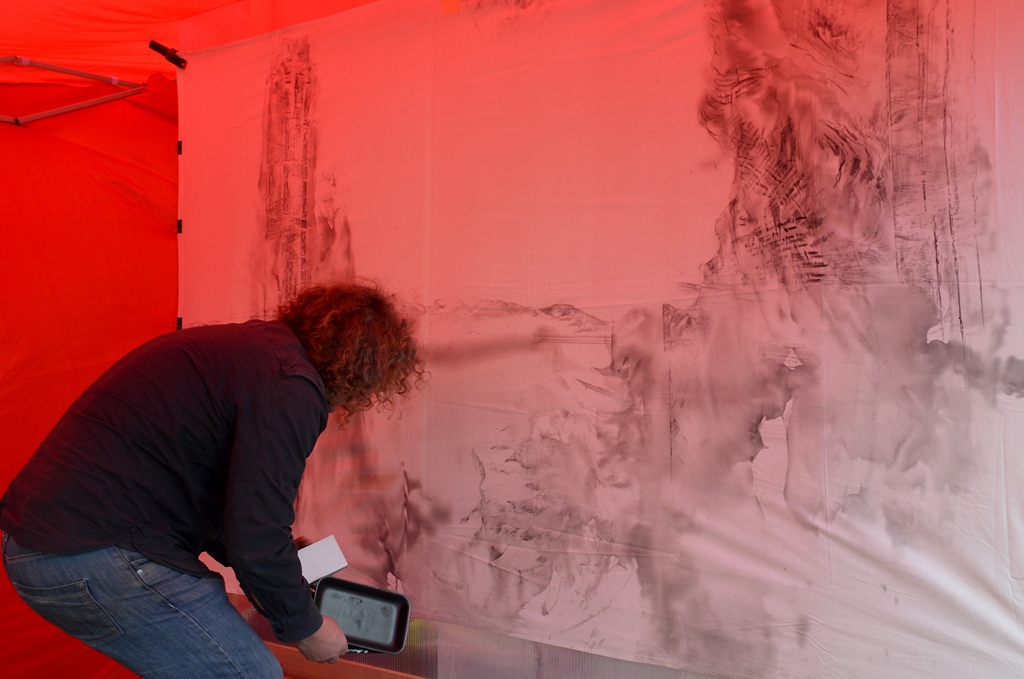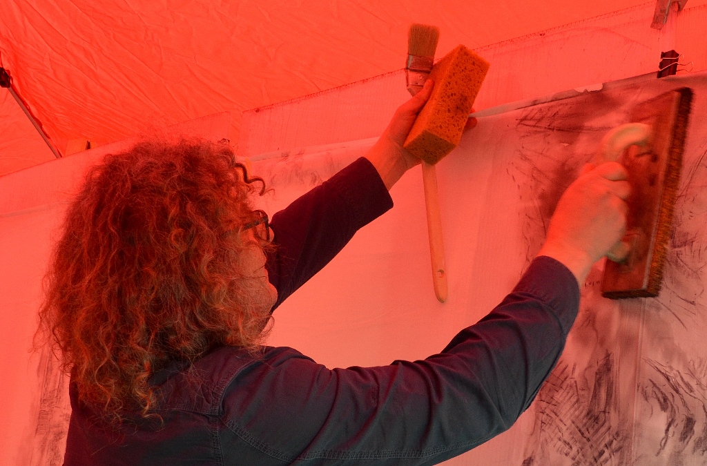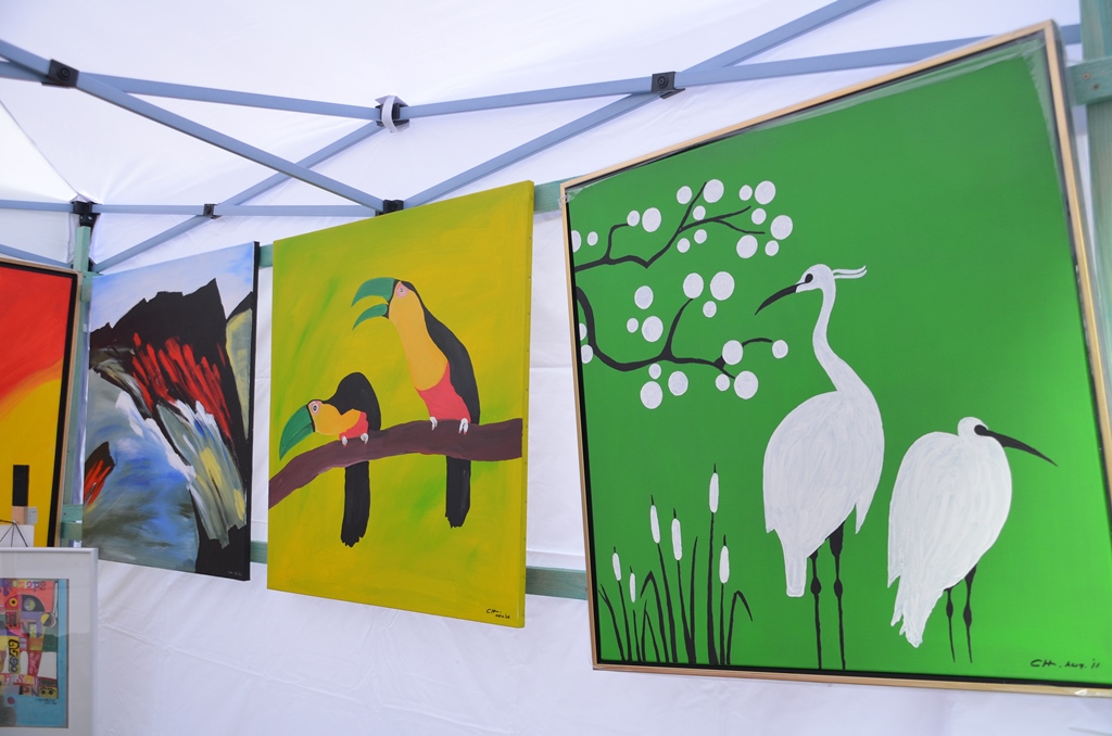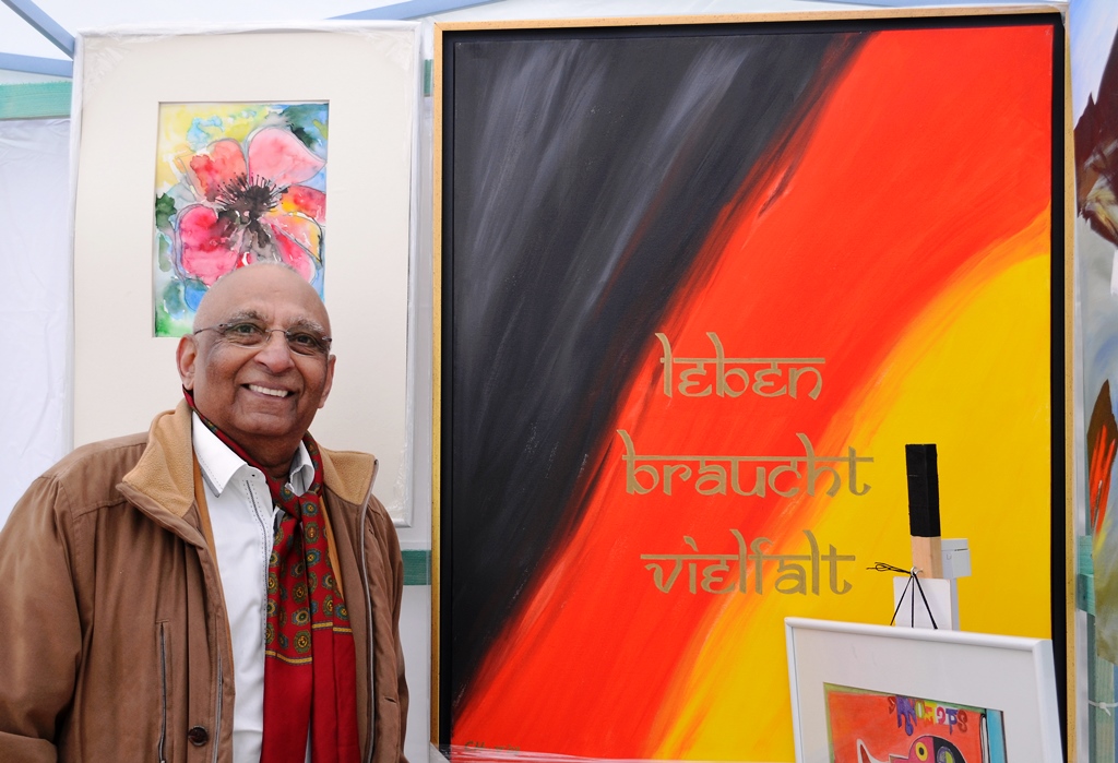 Zahlreiche weiße Pagodenzelte stehen entlang der Grünstraße, die heute teilweise gesperrt ist. Hier zeigen die Künstler interessierten Besuchern ihre Werke. Überall sieht man vor und in den Zelten kleine Gruppen im Gespräch. Die Künstler geben bereitwillig Auskunft. Für das Bild von Kanak Chandresa hat die Deutsche Flagge Pate gestanden. „Sie hat so lebendige Farben“, schildert er seine Wahl. „Nur in der Mitte fehlte mir etwas, wie in der Flagge Indiens ein Rad zu finden ist.“ Deshalb hat er kurzerhand den Ausdruck „Leben ist Vielfalt“ ins Zentrum des Bildes gesetzt. „Eine künstlerische politische Aussage“, nennt er es.