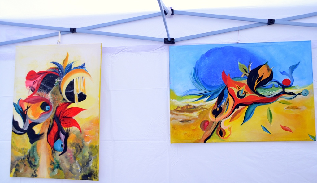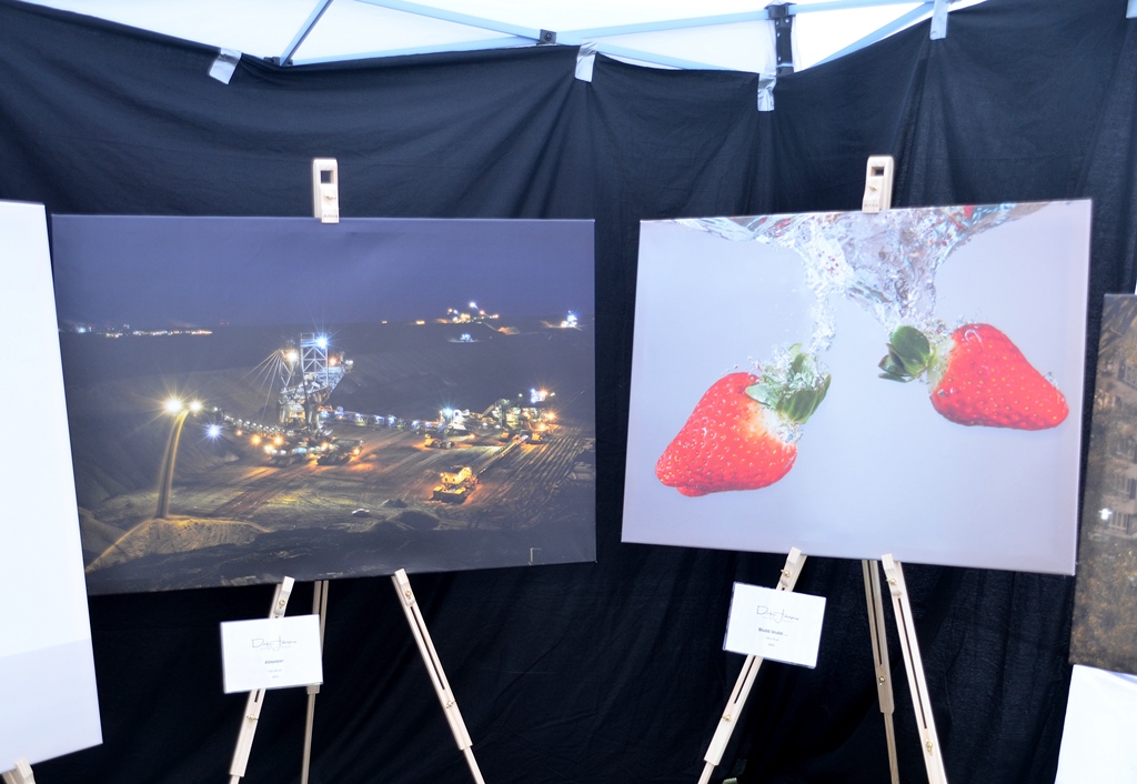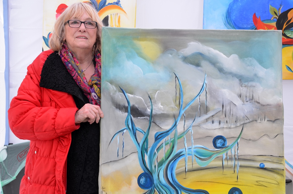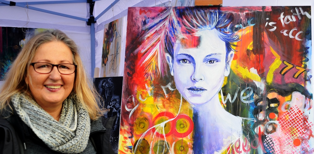 Horst Hermes, der am gleichen Stand steht, sucht seine Motive mit der Kamera. Der begeisterte Fotograf betreibt sein Hobby seit fünf Jahren. „Ich suche meine Motive in der Natur. Mit der Kamera bekommt man einen wesentlichen Blick für Details.“ Sein Lieblingsbild hat er in Andalusien gemacht. „Ich erfinde mich in meinen Werken immer neu“, sagt Hanna Nebel. „Ich mache meine Gedanken durch Kunst erlebbar. Es sind gemalte Träume. Oft schaffe ich daraus Serien.“ Eine davon, „Träumereien“, hat die Malerin heute mitgebracht. Ein anderes ihrer Werke ist aus der Serie „Wolkenreise“. „Ich gehe immer mehr in die surrealistische Art“, kommentiert sie das Werk.