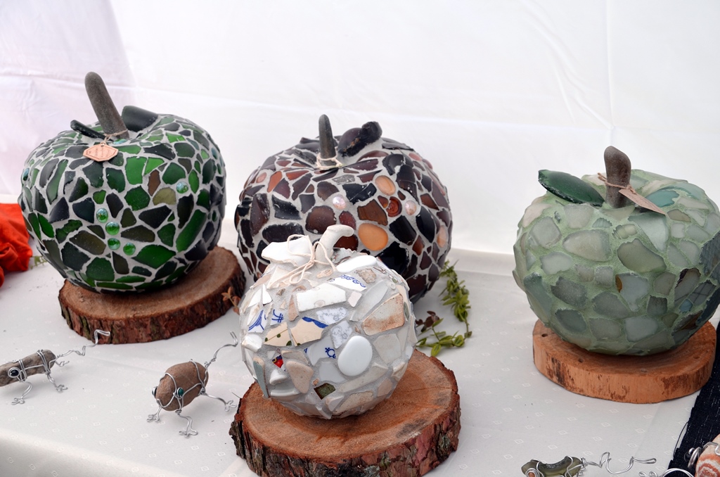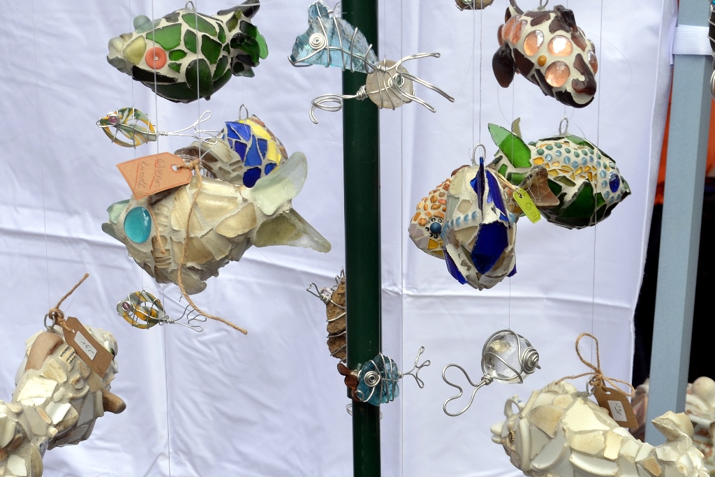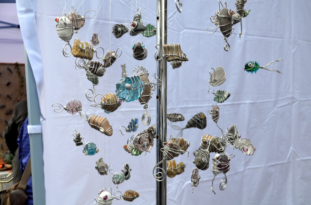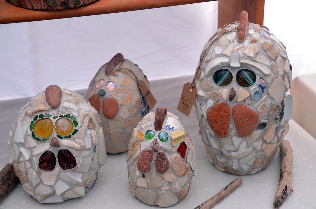 Bei Waltraud Lademann und ihrer Schwester Bärbel Rosenbaum gibt es in einem der Aktionszelte als Mitmach-Aktion „Wickeltechnik mit Aludraht und Stein.“ Die Schwestern machen Mosaike aus Scherben, die sie immer nach Hochwasser am Rand der Wupper sammeln. Zusammen mit wetterfestem Material entstehen daraus zauberhafte Mosaike, die auch für draußen geeignet sind.
