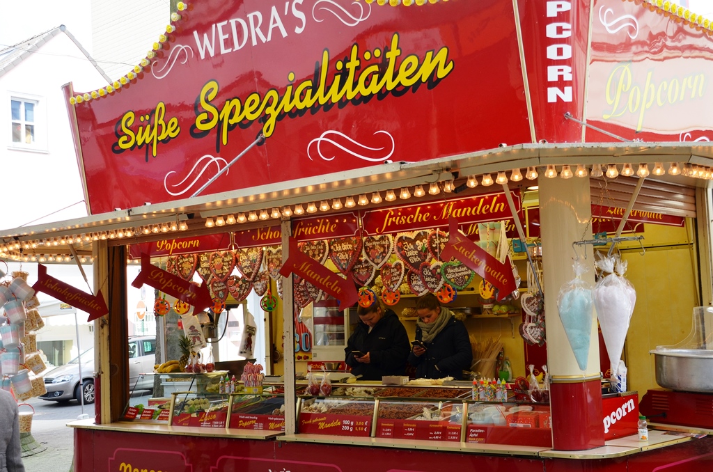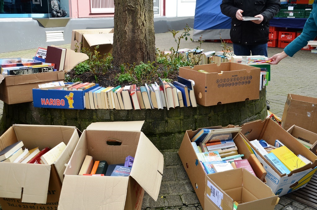 Auf der Düsseldorfer Straße kommen Leseratten und Bücherfreunde wieder voll auf ihre Kosten. Der traditionelle Büchermarkt lädt mit zahlreichen Ständen zum Stöbern ein. Von Kinderbüchern über Krimis, Sachbücher und Romanen ist wirklich alles dabei. Und was auf den Tischen keinen Platz mehr findet, steht in Kisten und Kartons darunter. Schnell finden die Bücher ihren Weg in die Taschen begeisterter Leser. Auf einer großen Leinwand zeigt Zoran Velinov den faszinierten Zuschauern, wie man mit Kohle fantasievolle Objekte zaubern kann. Seine Kunstwerke entstehen spontan und expressiv. Sie wirken wie einer mystischen Welt entsprungen. Meist malt er großformatige Naturmotive im kosmischen Stil.