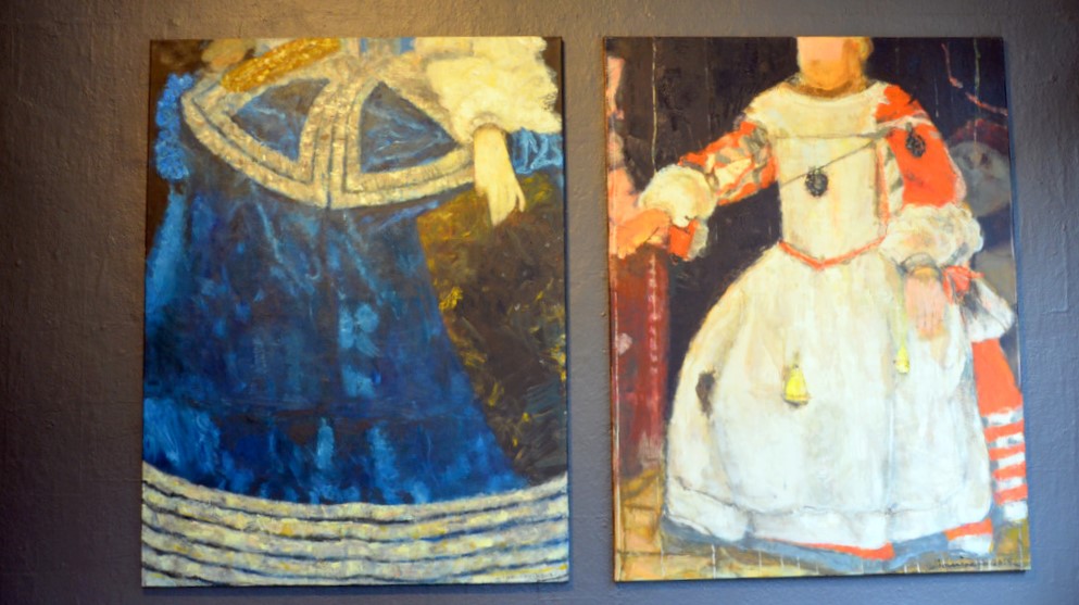 Die neue Ausstellung ist eine Anlehnung an den spanischen Maler Diego Velázquez (mit vollständigem Namen Diego Rodríguez de Silva y Velázquez). Der spanische Maler des Barocks (1599 – 1660) war schon seit dem 19. Jahrhundert Vorbild für eine Vielzahl von Malern. „Es hat mich immer wieder verblüfft, wie modern seine Malerei ist“, gibt Iacob bereitwillig zu. Die dargestellten Kleider nehmen rund 90 Prozent des Bildes ein, mit wenig Hintergrund. „Gesichter und Hände hat er nur gemalt, weil es eine Auftragsarbeit des spanischen Königs Felipe IV. war. Hier war er manieriert. Aber die Kleider waren für Velázquez die Hauptsache“, traut sich Künstler Iacob an eine Behauptung. „Ich erfahre erst jetzt so richtig, welch großartiger Maler der Spanier tatsächlich war. Je mehr ich hinschaue, desto mehr sehe ich. Velázquez hat beim Aufbau seiner Bilder verschiedene Register: Licht und Schatten, hell und dunkel, Ornamentik. So habe ich festgestellt, wie er malt.“