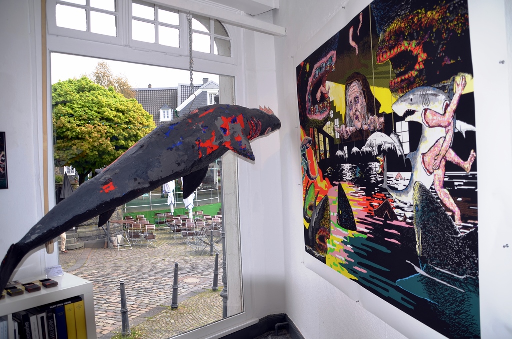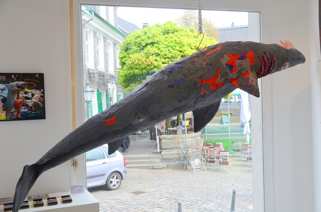 SOLINGEN (mh) – Vom 6. Mai bis 11. Juni gibt es in der Galerie ART-ECK ein wirkliches „Hailight“. Der holländische Künstler Rudolf Valster (*1963) zeigt Skulpturen, Gemälde, Wandgemälde und Drucke, die den Hai in vielschichtiger Weise darstellen. Schon beim Blick durch das Fenster sieht der Betrachter auf eine riesige Skulptur. Ein 25 Kilo schwerer Hai hängt an einer großen Kette von der Decke herunter. Zwei Monate brauchte der Künstler für die Gestaltung.