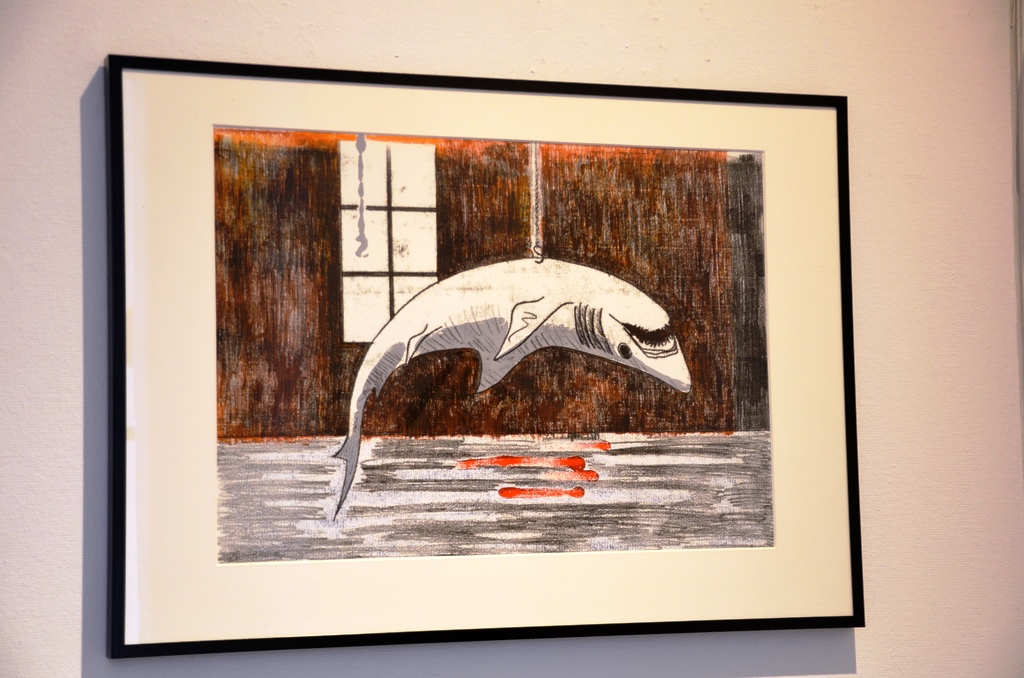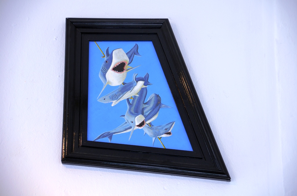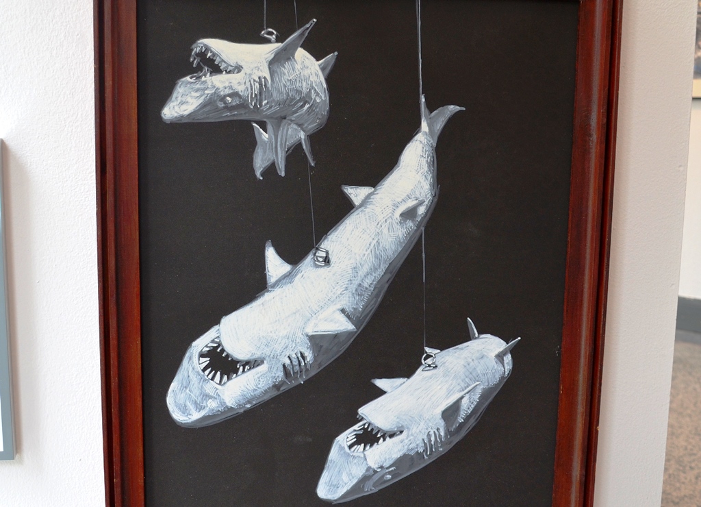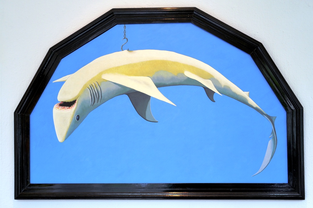 Der Künstler macht die Verletzlichkeit des Hais deutlich. Mal hängt das Monster an einer großen Kette von der Decke herab, mal wird er aufgespießt. Ein anderes Gemälde zeigt den gefährlichen Killer, hilflos, mit einem Haken im Bauch. Tragik, Melancholie, Gefahr.