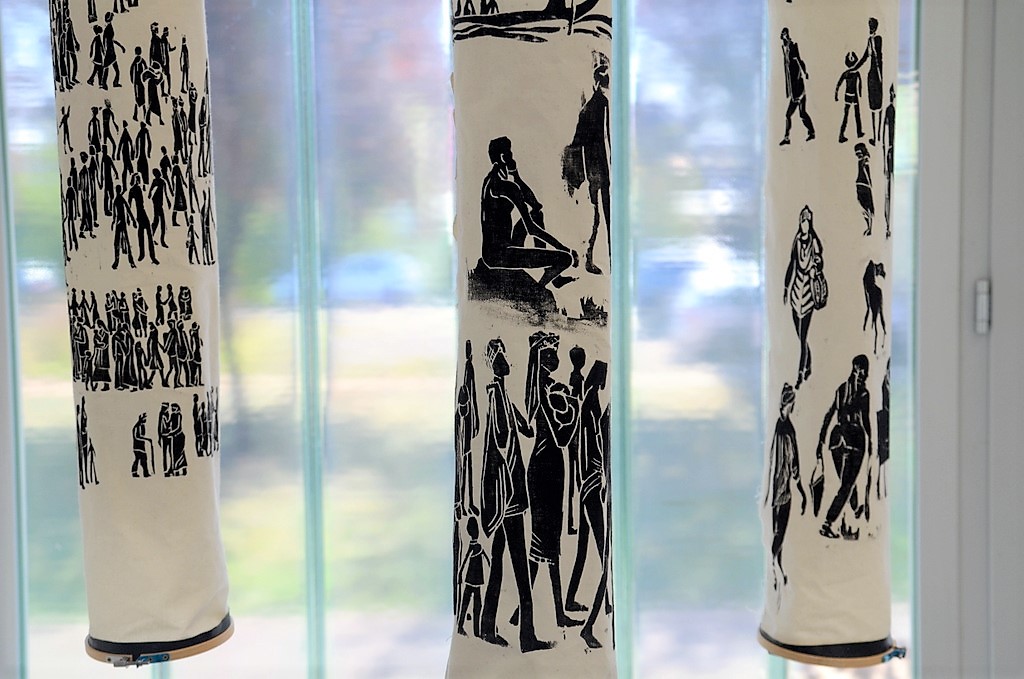 Bei Carmen Meiswinkel reihten sich reliefartig Figurenbilder an den Seiten eines Pfeilers aneinander. Der Wegweiser in seiner Mitte offenbarte die eingeschnittenen Worte „Die Würde des Menschen ist unantastbar – in Ewigkeit“. Darüber hängende Röhren aus Papier versinnbildlichten Menschen auf der Suche nach einem besseren Leben. Damit nimmt die Künstlerin Stellung zu den Flüchtlingsströmen damals wie heute.