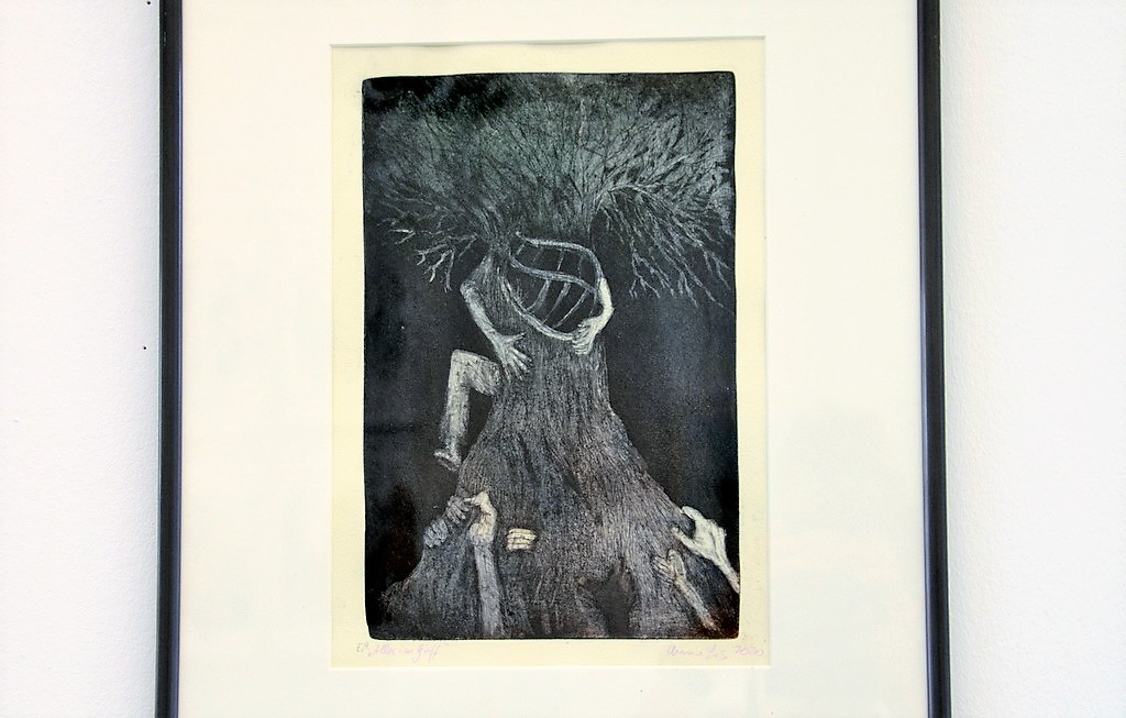 Boris von Reibnitz verfolgte in seinem Holzschnitt auf fast spielerische Weise den Weg von der Skizze zum Vierfarbdruck. Die Farbgebung ermöglichte einen Übergang vom Statischen ins Dynamische. Im Gegensatz dazu spiegelte das Gesicht des Drachenmanns von Alvar Siefert in harten Schwarz-Weiß-Linien den Ausdruck des unter Kontrolle Stehenden. Maria Pienkowski demonstrierte in der Käfigform mit der dunklen Vogelsilhouette symbolhaft das Leiden des Gefangenseins.