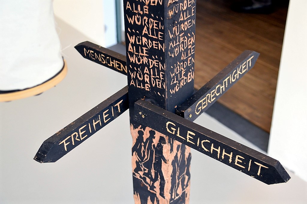 In ihrem Wegweiser nimmt Künstlerin Carmen Meiswinkel mit dem Hinweis auf das Grundgesetz Stellung zu den Flüchtlingsströmen auf der Suche nach einer besseren Welt. (Foto: © Martina Hörle)