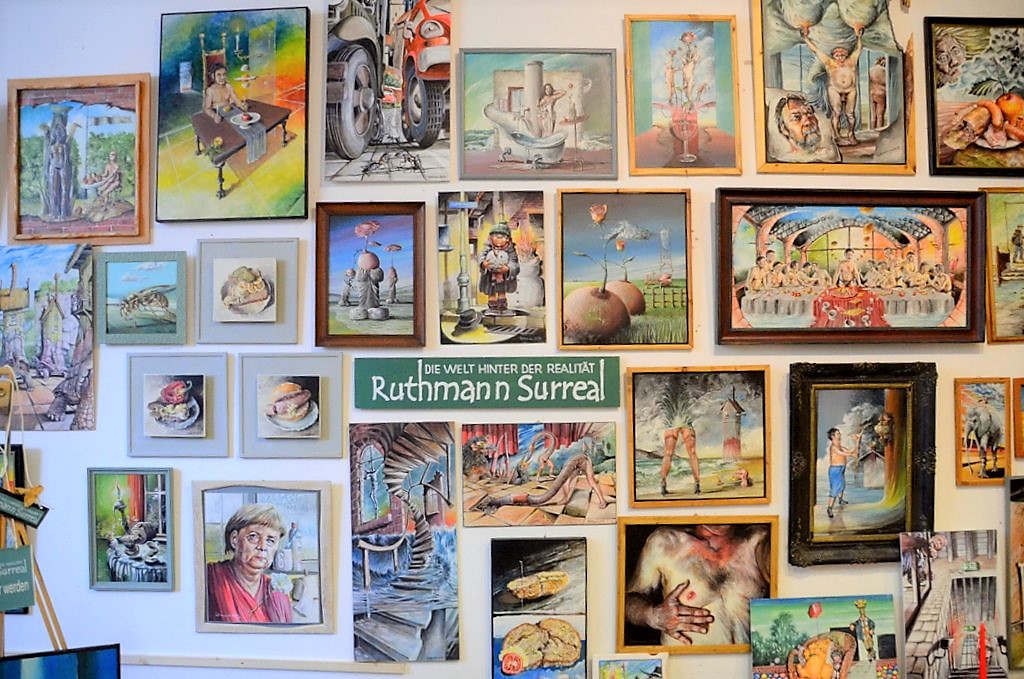 Lothar Ruthmann, Künstler und Galerist, hat gemeinsam mit Sohn Christoph eine einzigartige Location geschaffen. Gleich im Eingangsbereich zeigt er selbst einen Auszug seiner vielfältigen Werke. Der Künstler möchte mit seinen Arbeiten provozieren, das Ganze aber auch gerne mit einem Augenzwinkern. Er konfrontiert die Realität mit seiner Traumwelt, die in ihrem Surrealismus stark an Dali erinnert. Hier ist Ruthmann mit einer unerschöpflichen Kreativität völlig in seinem Element. Sein Sohn übernimmt den organisatorischen Part und sorgt für den reibungslosen Ablauf der vielen Aktivitäten.
