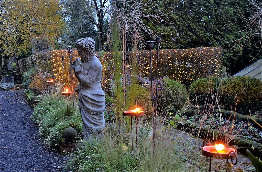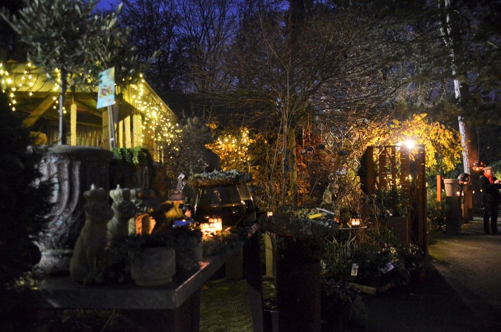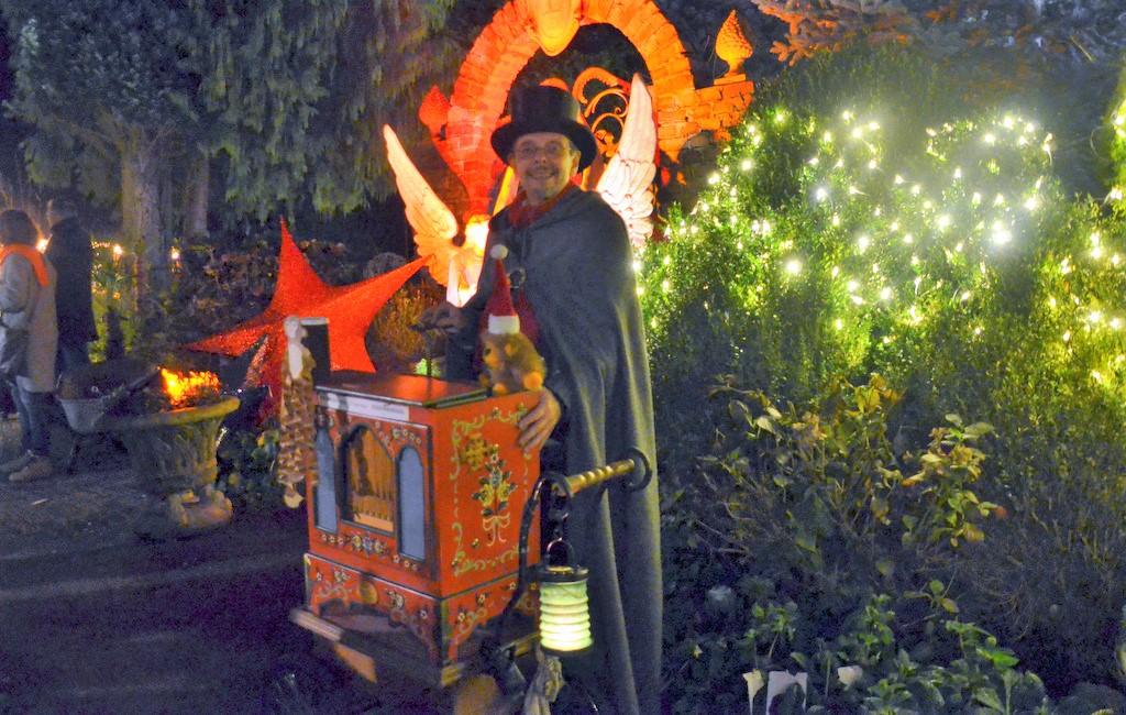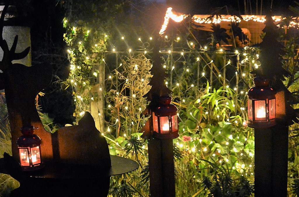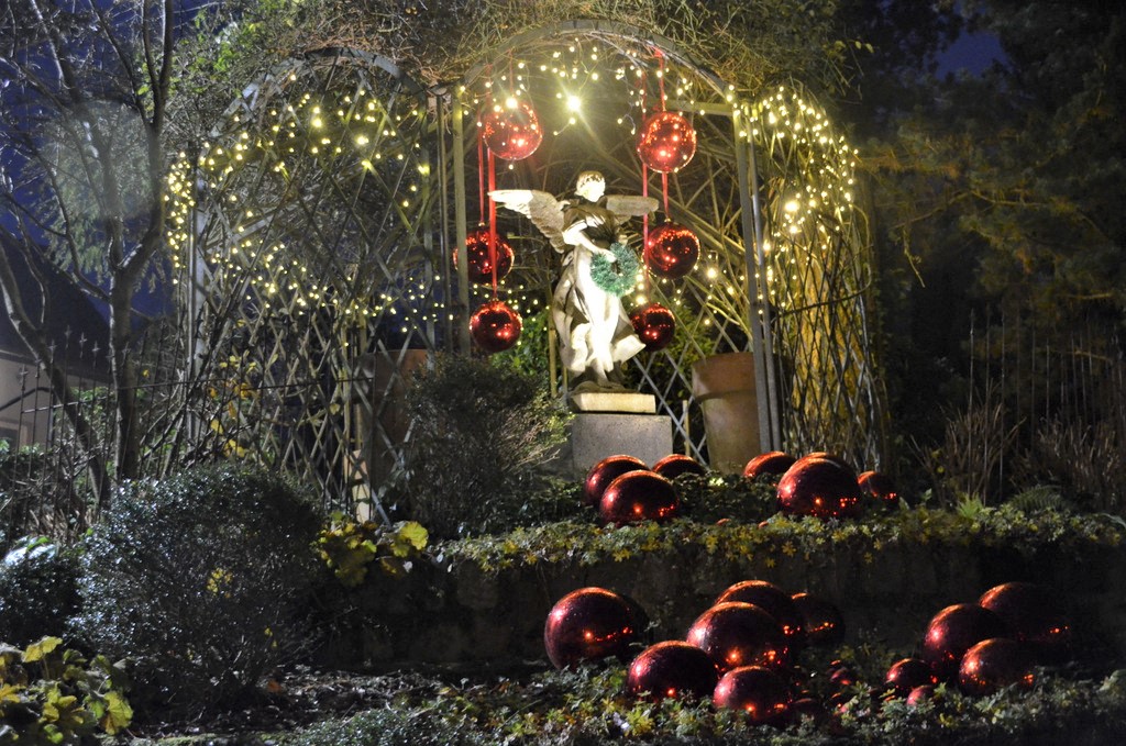 Während die 12 Gartenzimmer bereits im Winterschlaf liegen, ist der vordere Teil der Anlage mit unzähligen Lichtern geschmückt. Bäume und Sträucher tragen Kleider aus Lichterketten. Feuerschalen säumen den Weg für die Besucher. Überall verbreiten Kerzen besinnliche Atmosphäre. Ein alter Ofen bullert vor sich hin. Das knackende Holz und die in die Luft steigenden Funken bringen klassisches Weihnachtsfeeling.