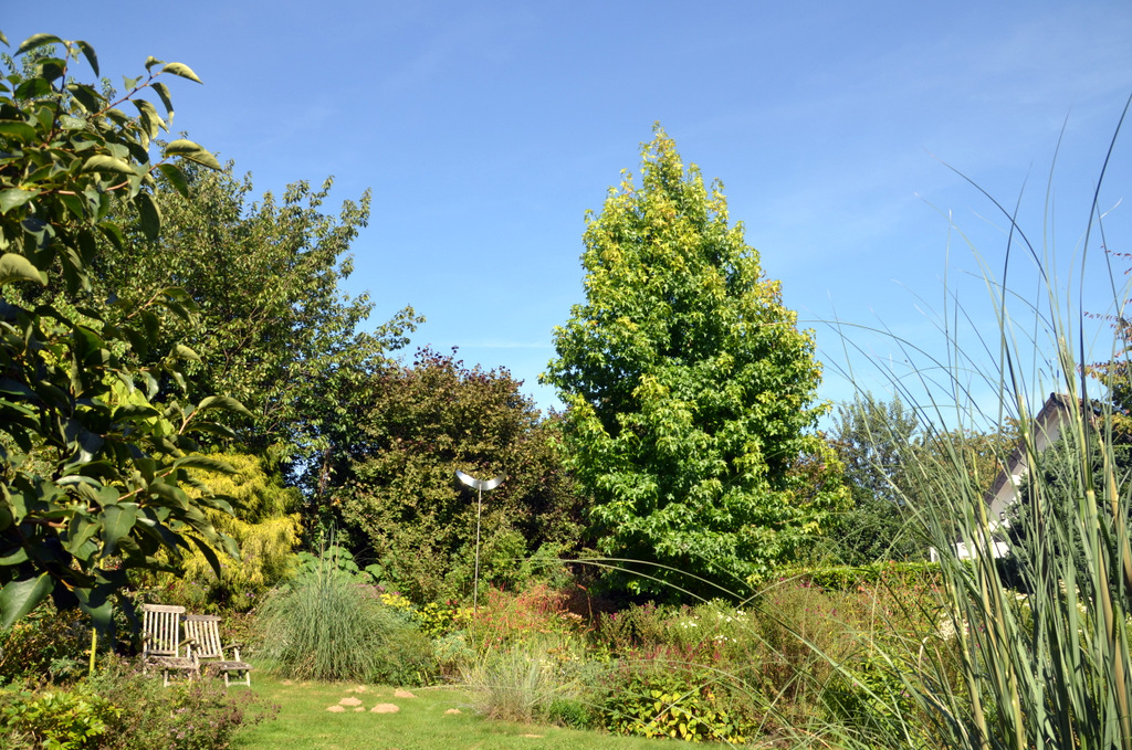 Beeindruckend ist der große Amberbaum, dessen Laub jetzt langsam in leuchtenden Orange- und Rottönen erstrahlt. „Je mehr Sonne die Blätter erhalten, desto intensiver wird ihre Herbstfärbung“, erklärt Vogel begeistert. Amberbäume zählen zu den schönsten Laubbäumen. Sie sind bekannt für ihren traumhaften Indian Summer, der mit einem regelrechten Feuerwunder den Garten in ein warmes Licht taucht.