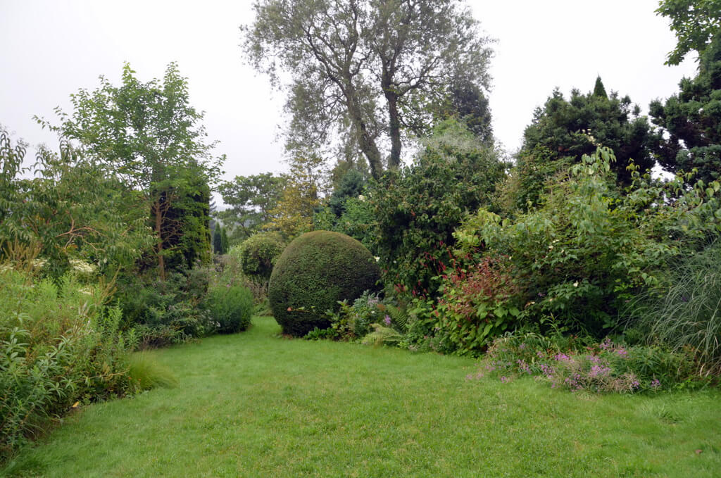 Im Unterschied zu den anderen Gartenzimmern sind hier nur wenige dekorative Fundstücke zu sehen. Das Hauptaugenmerk liegt auf der bemerkenswerten Vielfalt ausgesucht schöner und interessanter Gewächse. Eine Kaki, vor rund zehn Jahren aus Freiburg mitgebracht, fühlt sich mittlerweile absolut heimisch, auch wenn das Freiburger Klima etwas milder ist. Bis zur Fruchtreife braucht sie daher etwas mehr Zeit.