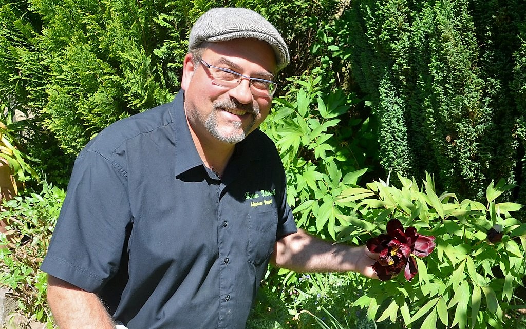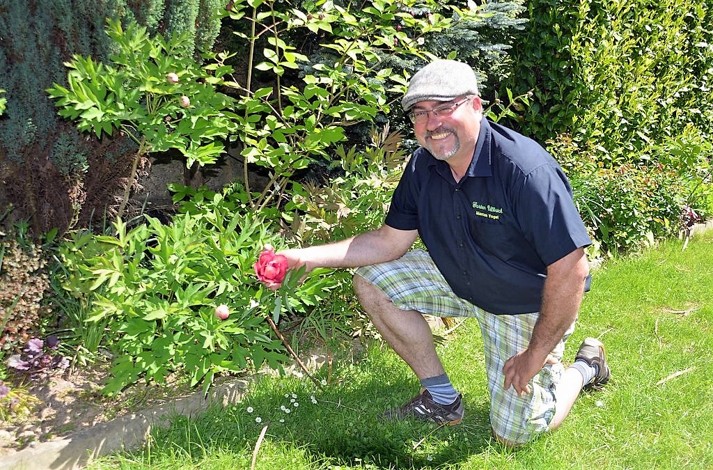 Die Päonien stehen gerade in voller Blüte. „Mein Highlight ist die Black Panther. Diese Blüte ist einfach faszinierend“, schwärmt Markus Vogel. Die Strauchpfingstrose hat tiefrote bis ins Blau changierende Blütenblätter, die wie Samt scheinen. Die halb gefüllten Blüten weisen einen beachtlichen Durchmesser auf. „Ich bin jedes Jahr aufs Neue gespannt, wann sie zu blühen beginnen“, gesteht der Gärtner. „Die Pflanze wächst sehr langsam und es dauert, bis sie ihre Blüte entwickelt.“ Auch preislich muss man schon tiefer in die Tasche greifen. „Sie ist ein Rolls-Royce unter den Pflanzen.“