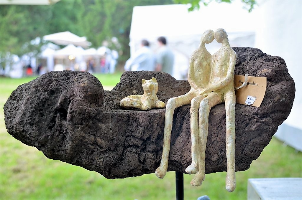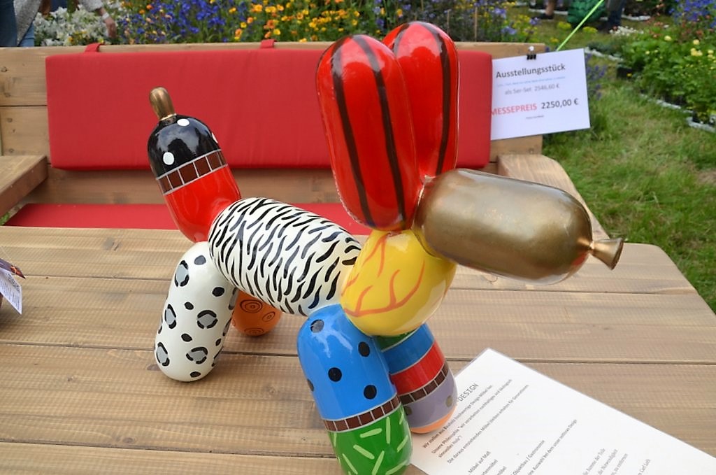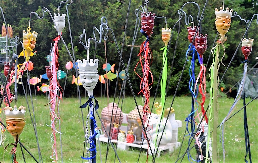 Bei Künstler Stefan Seeger zieht ein Schwarm Holzfische vorbei. Ein Teil von ihnen trägt das Markenzeichen des Künstlers – eine Krone. „Ich habe mein Programm erweitert“, lacht der Künstler. Auch seine bekannten Flying Kings gibt es jetzt in veränderter Form mit wehenden Bändern. Obendrein hat er Kunstwerke von einem Künstlerkollegen mitgebracht. Der Niederländer Niloc Pagen liebt ausgeprägte Formen und helle Farben.