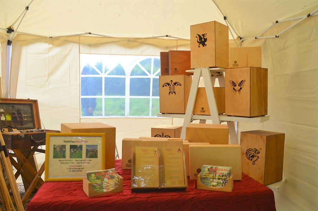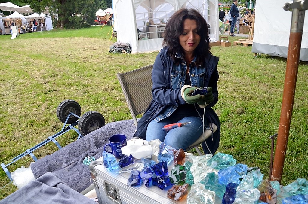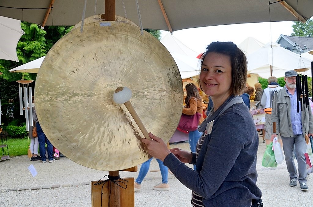 Gleich beim Eingang empfangen sphärische Klänge die Besucher. Der Wind streicht durch die aufgehängten Klangspiele aus Aluminium. Stefanie Bauer ist zum ersten Mal als Ausstellerin dabei. „Seit über 25 Jahren stellen wir in der Eifel unsere Produkte her. Wir sind die Einzigen, die Klangspiele, Klangstäbe und Türharfen selbst entwickeln, herstellen und vermarkten“, berichtet Bauer. So wird jedes Teil mit seinem individuellen Klang zum Unikat. „Unsere Klangspiele berühren die Sinne. Genau darum geht es uns.“ Die Qualität bei Gestaltung, Material und Verarbeitung sei für sie von großer Bedeutung, weiß Bauer zu berichten. Neben dem Sortiment aus eigener Produktion wird die Palette durch Klangschalen aus Indien und Gongs aus China abgerundet.