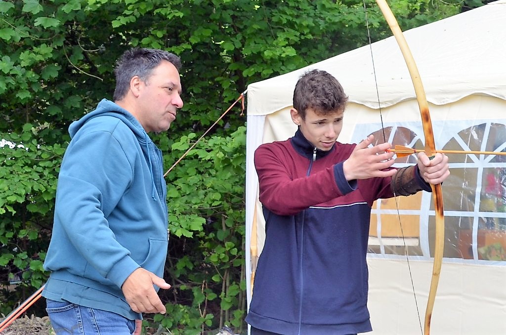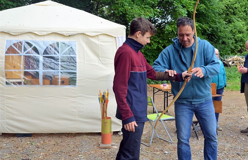 Wer sich beim Bogenschießen versuchen möchte, kann das bei Klangbauer Edgar Hilgendorf tun. Der Musiker und staatlich anerkannte Familienpfleger ist ebenfalls ausgebildeter Holz- und Metallhandwerker. „Den Klangbau gibt es seit 20 Jahren“, sagt Hilgendorf. „Aus eigener Liebhaberei folgte dann fünf Jahre später der Bogenbau.“ Hier kommen verschiedene Holzarten zum Einsatz, in der Hauptsache Robinie und Esche. Manchmal sind sie zusammen mit Kirsche oder Eibe verarbeitet. Der Bogenbauer gibt Workshops in Kleingruppen.
