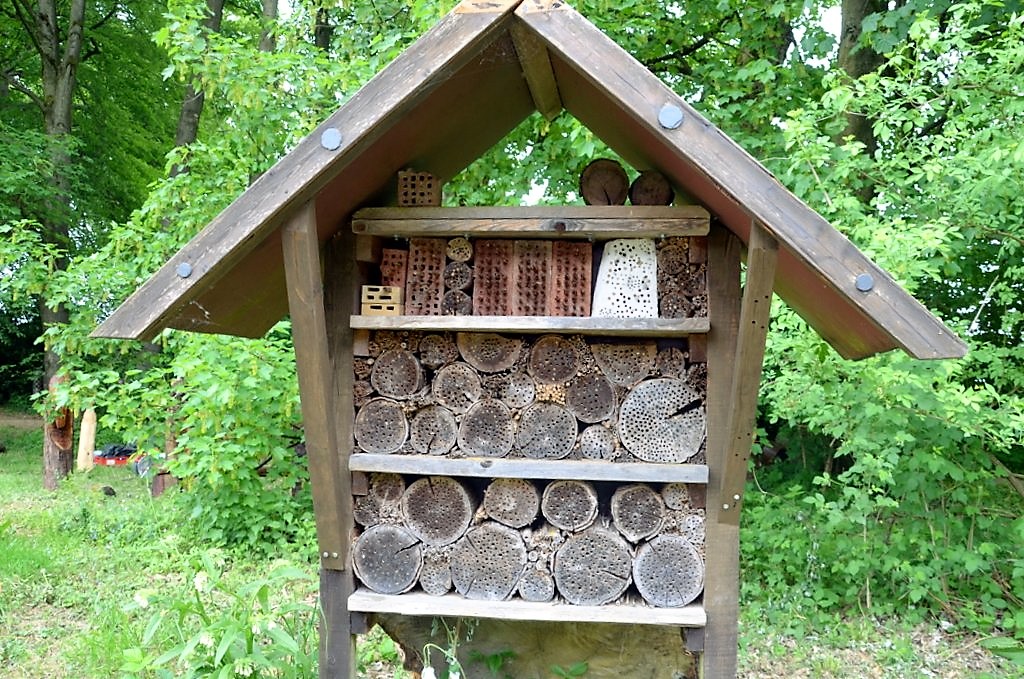 Naturfreunde können sich am Insektenhotel über Schutz und Leben der Tiere informieren. Im Gegensatz zu den Honigbienen sind sie Einzelgänger in der freien Natur. Sie leben in totem Holz oder häufig in sandhaltigen Böden. Wildbienen bestäuben genau wie andere Insekten auch, liefern dem Menschen aber keinen Honig. Sie gehören zu den besonders geschützten Tierarten. Bemerkenswert ist ihr sehr kurzes Leben, was bei männlichen Tieren bereits nach sechs Wochen endet und bei den Weibchen nach acht Wochen.